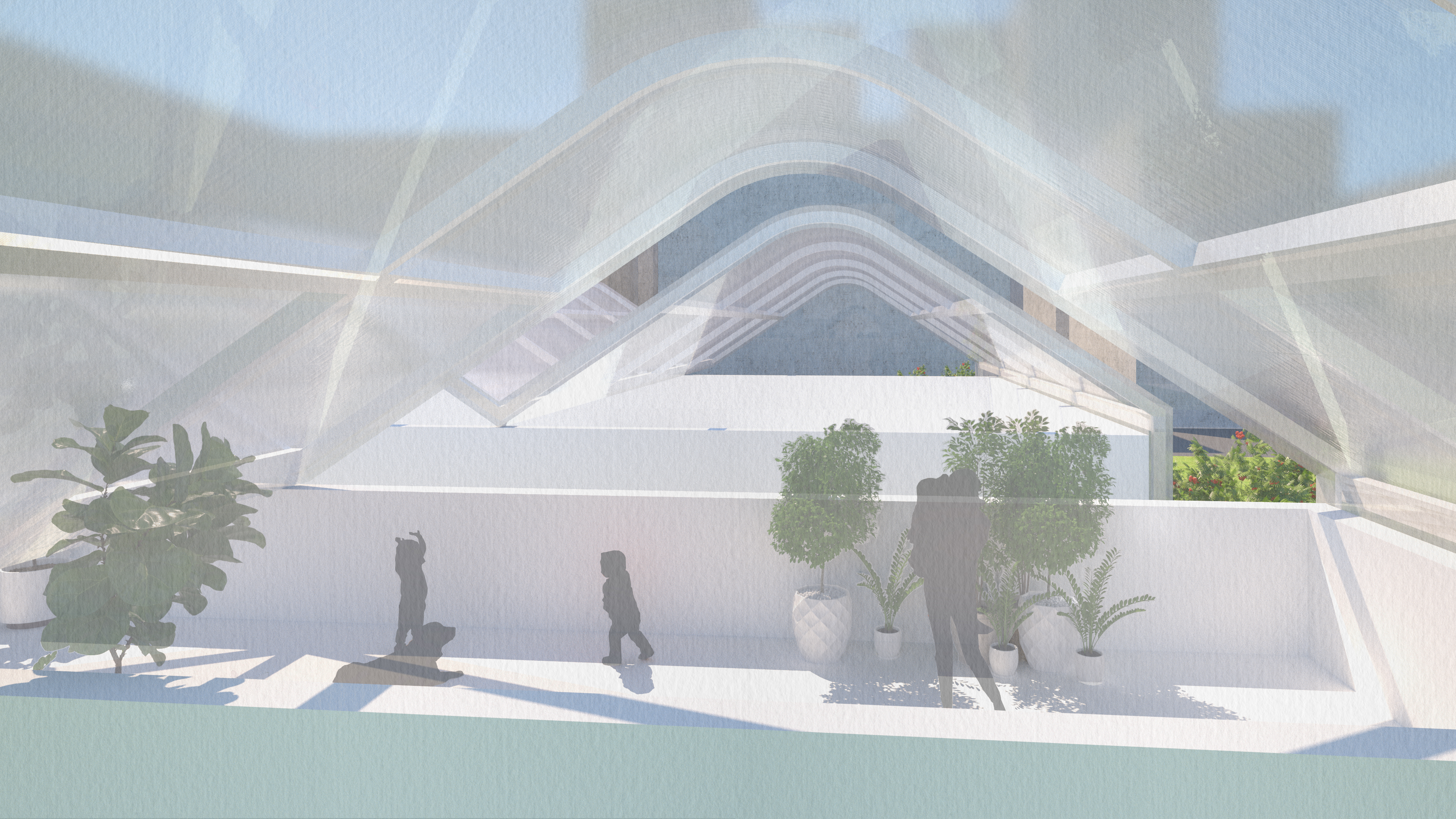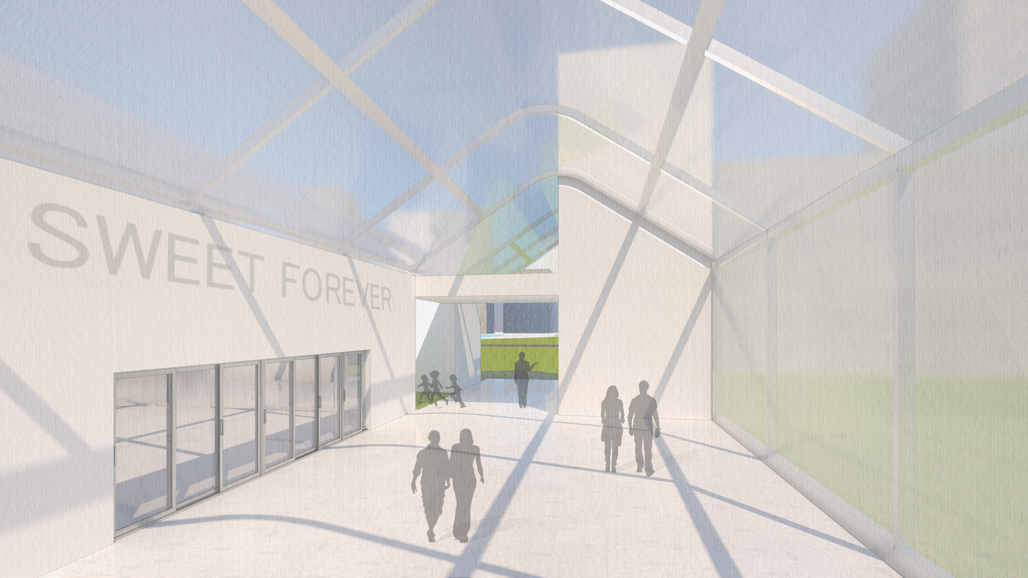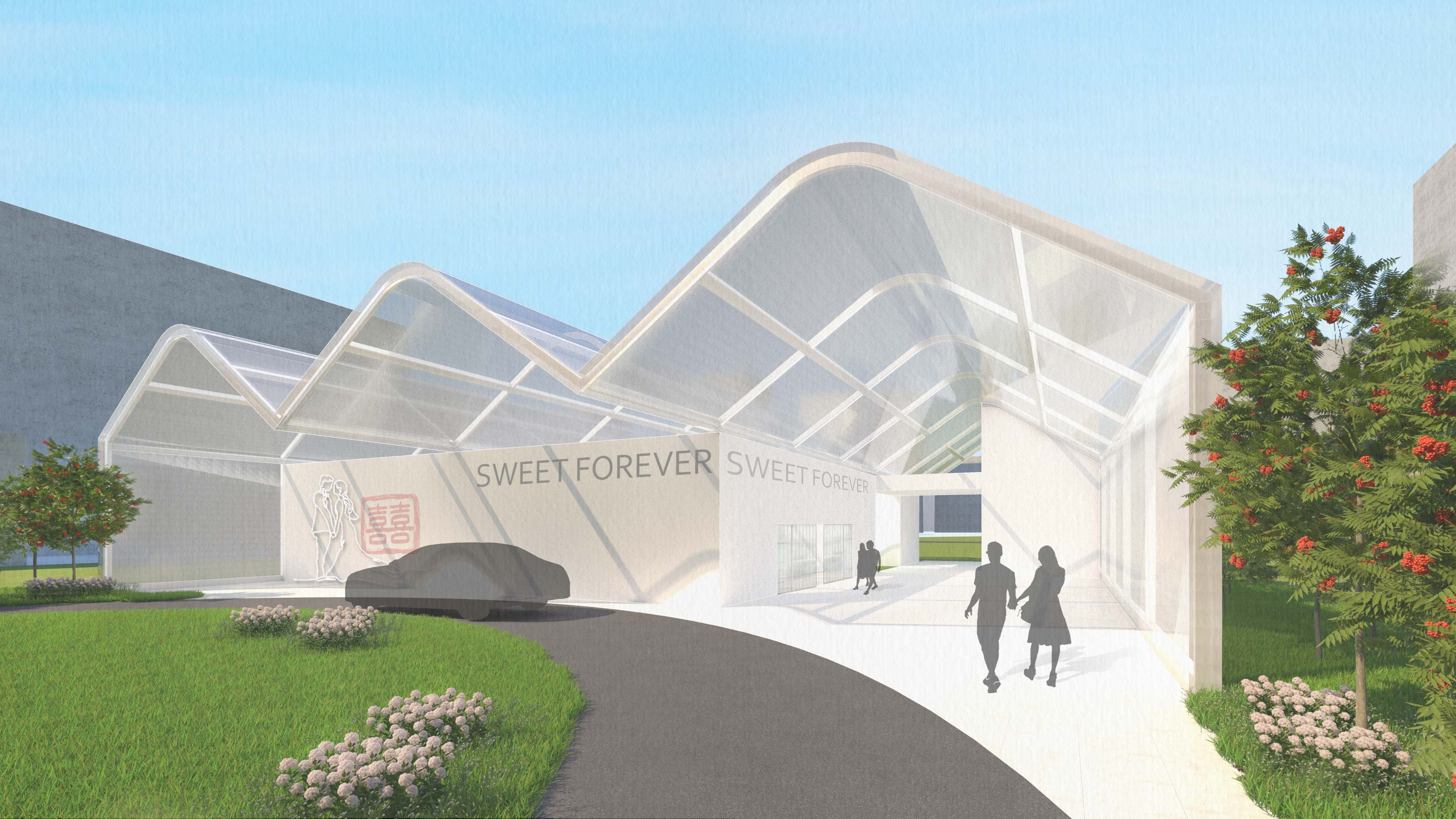 Couples visit this castle filled with imagination and expectation. Choosing a wedding cake is one of the most important parts of wedding preparation, and this dessert factory, which holds their dreams, makes many people's dreams come true. When the bride and groom visit this place, it feels like stepping into a fairy tale, with everything seemingly created just for them. The air is filled with the aroma of desserts, and the factory's dedication to making desserts can be felt even through the translucent glass walls. The factory is not just a cold machine; we want to create a warm and bright image to depict their stories together with visitors. a. The wide opening of the floor-to-ceiling door blurs the boundary between indoors and outdoors. b. Able to show how the factory operates for visitors to understand, but without interfering with the work. c. The three volumes differentiate the functions of each building. Semi-open space to separate each other, so that the emotions of activities will not be disturbed by the image of the factory. d. The continuous mountain wall roof continues the scene's imagination and connects each other. From the entrance to the inner area, it is like the script of a fairy tale, following the moving line and developing the story. e. The transparency of the façade, which is just one person's height of transparent glass, serves as one of the ways of interaction between the interior and exterior of the building, making the spatial scale comfortable and easy to get close to. f. The use of materials shows a visual sense of lightness, and the factory's huge volume will not make people feel oppressed. g. The use of PC boards, a semi-transparent material, allows us to see the form without the constraints of a steel frame so that the entire space image is soft and gentle as if we were in a cloud dreaming. h. The tower is the symbol of the factory and echoes the other two volumes of the factory. i. The rear volume, which is detached from the working area, can be used as a meeting place during the holidays.