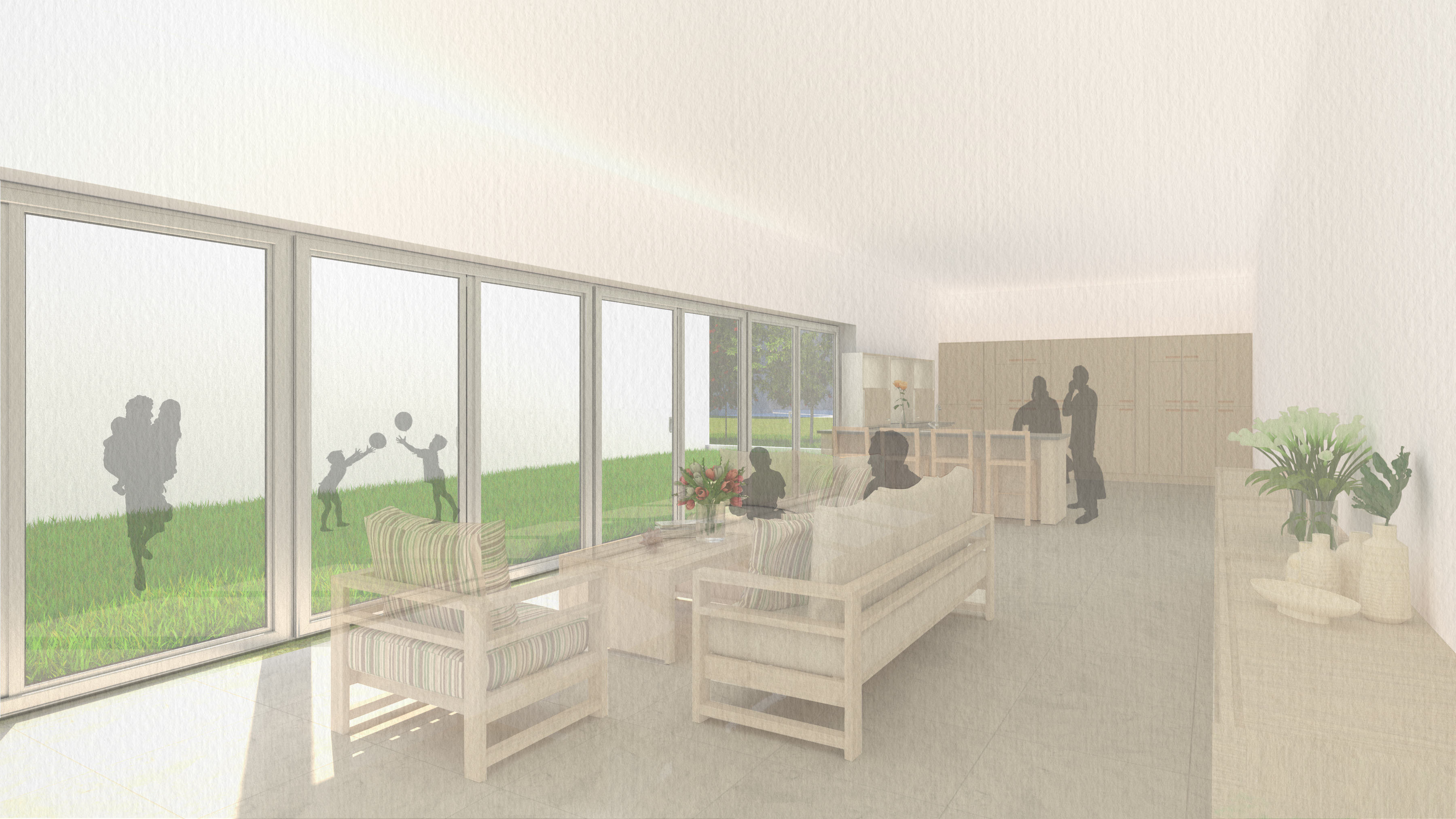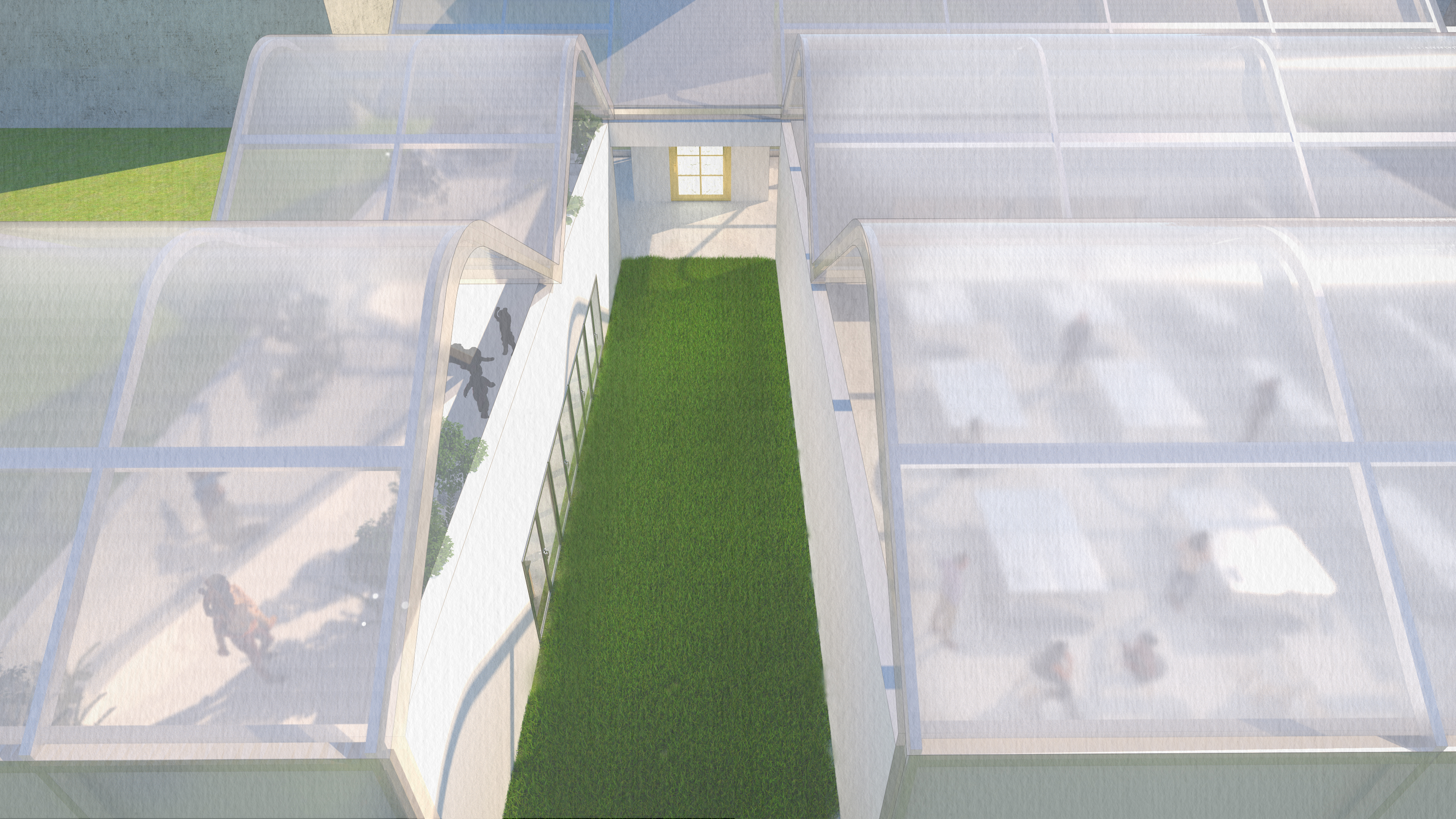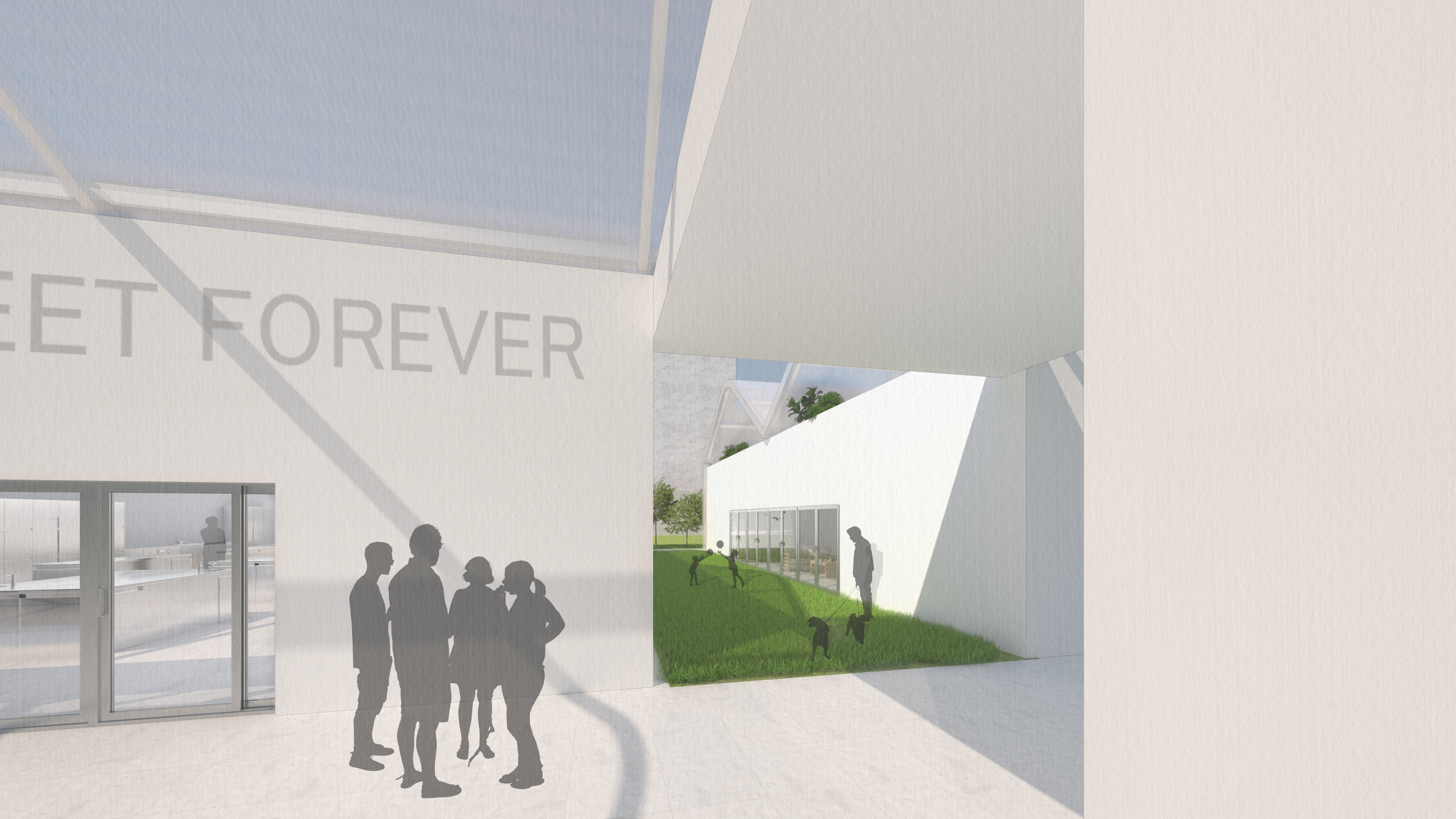 Couples visit this castle filled with imagination and expectation. Choosing a wedding cake is one of the most important parts of wedding preparation, and this dessert factory, which holds their dreams, makes many people's dreams come true. When the bride and groom visit this place, it feels like stepping into a fairy tale, with everything seemingly created just for them. The air is filled with the aroma of desserts, and the factory's dedication to making desserts can be felt even through the translucent glass walls. The factory is not just a cold machine; we want to create a warm and bright image to depict their stories together with visitors. a. The wide opening of the floor-to-ceiling door blurs the boundary between indoors and outdoors. b. Able to show how the factory operates for visitors to understand, but without interfering with the work. c. The three volumes differentiate the functions of each building. Semi-open space to separate each other, so that the emotions of activities will not be disturbed by the image of the factory. d. The continuous mountain wall roof continues the scene's imagination and connects each other. From the entrance to the inner area, it is like the script of a fairy tale, following the moving line and developing the story. e. The transparency of the façade, which is just one person's height of transparent glass, serves as one of the ways of interaction between the interior and exterior of the building, making the spatial scale comfortable and easy to get close to. f. The use of materials shows a visual sense of lightness, and the factory's huge volume will not make people feel oppressed. g. The use of PC boards, a semi-transparent material, allows us to see the form without the constraints of a steel frame so that the entire space image is soft and gentle as if we were in a cloud dreaming. h. The tower is the symbol of the factory and echoes the other two volumes of the factory. i. The rear volume, which is detached from the working area, can be used as a meeting place during the holidays.