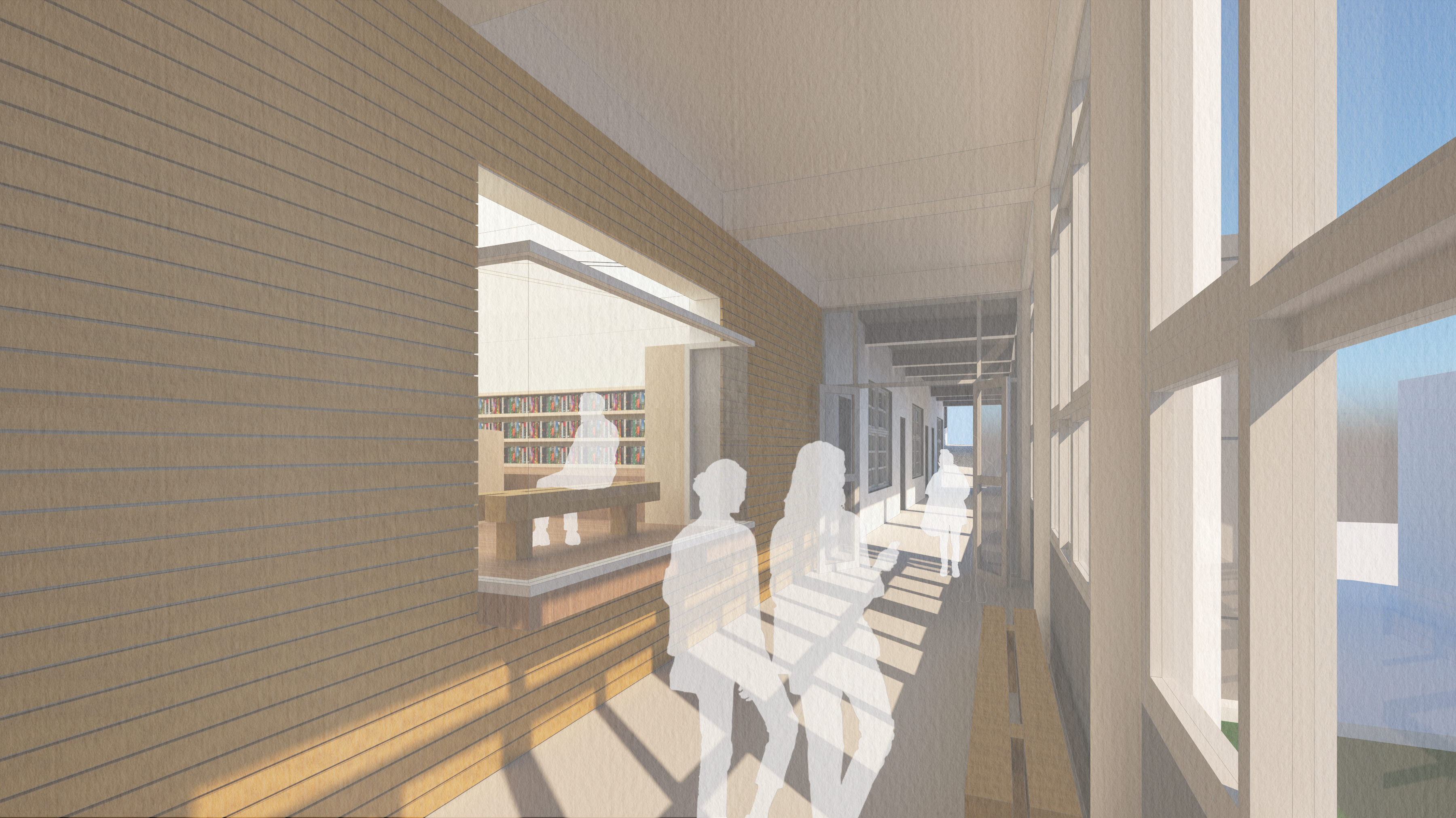 a. 本區為閱覽室主要出入口,因兩側皆有樓梯,為最容易親近的介面。因此於本通道僅作為圖書室使用,地坪舖設塑膠木地板搭配牆面質感。另設置花旗松木座椅供本空間閱覽使用,搭配中庭景觀以及充足之南向光線,必定使本區域成為校園內最明亮、清新之閱讀空間。