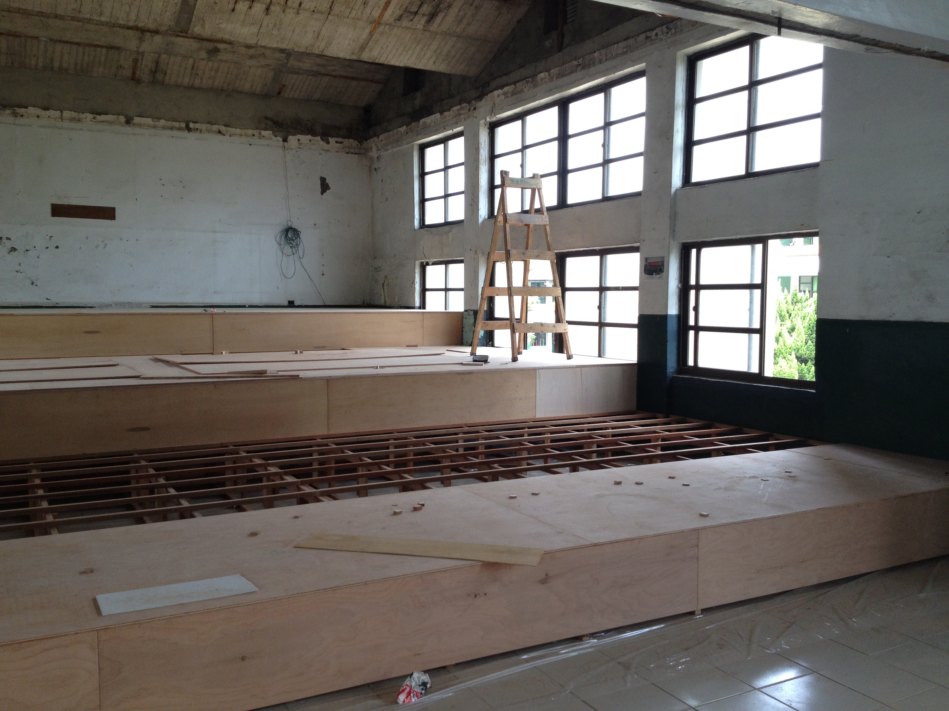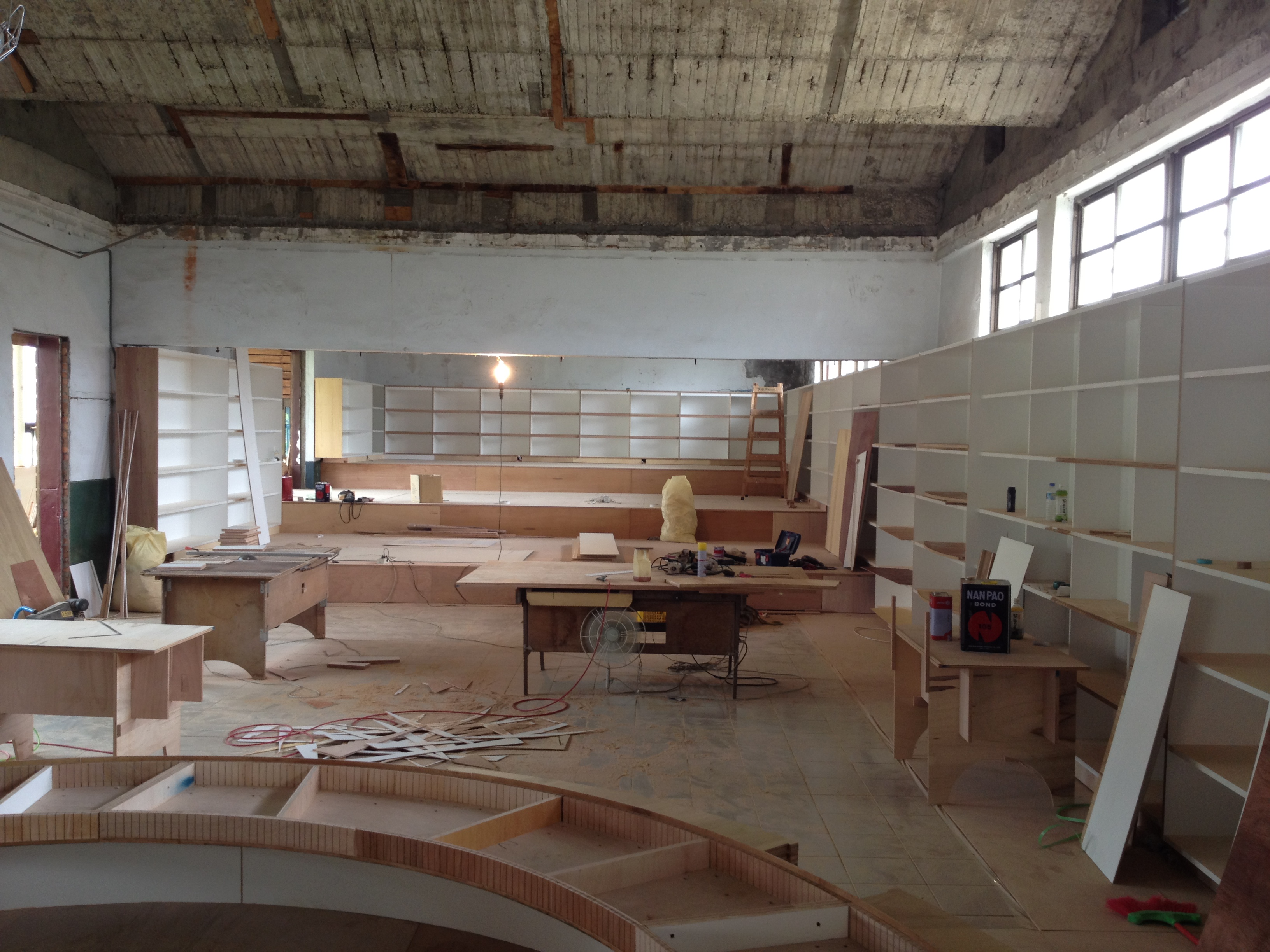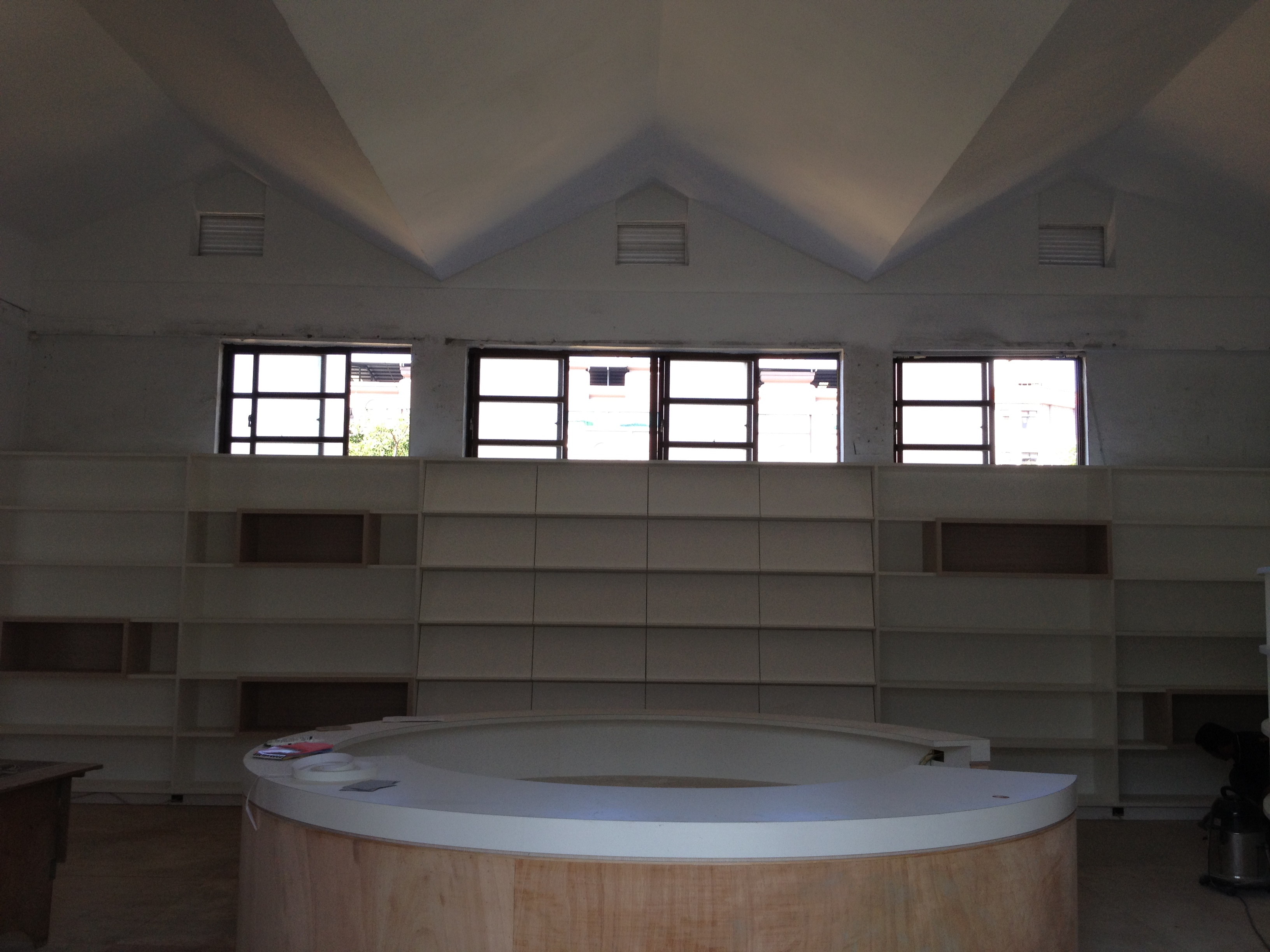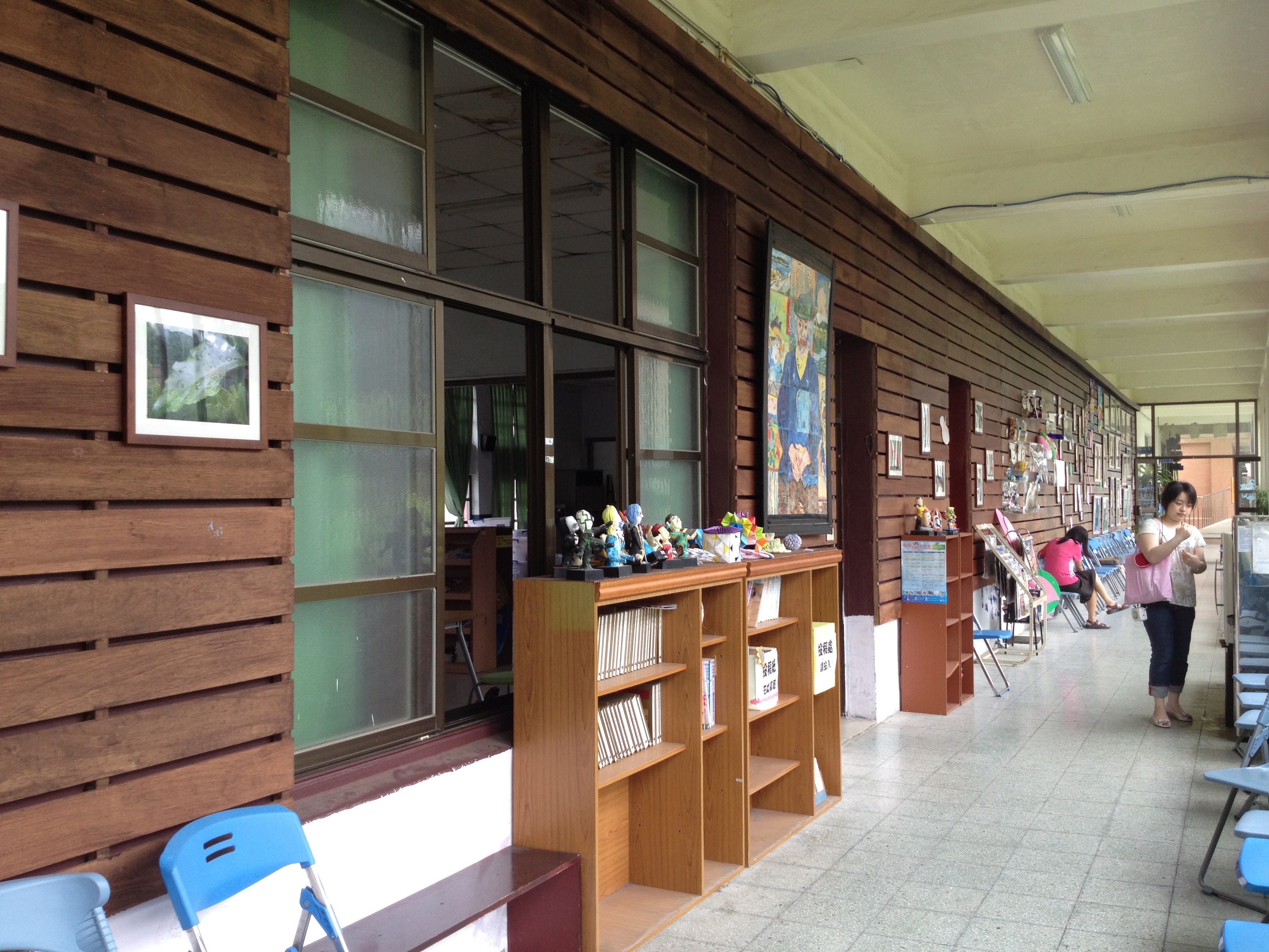 At the entrance of the library, the wooden countertop and plastic flooring are used as the countertop.