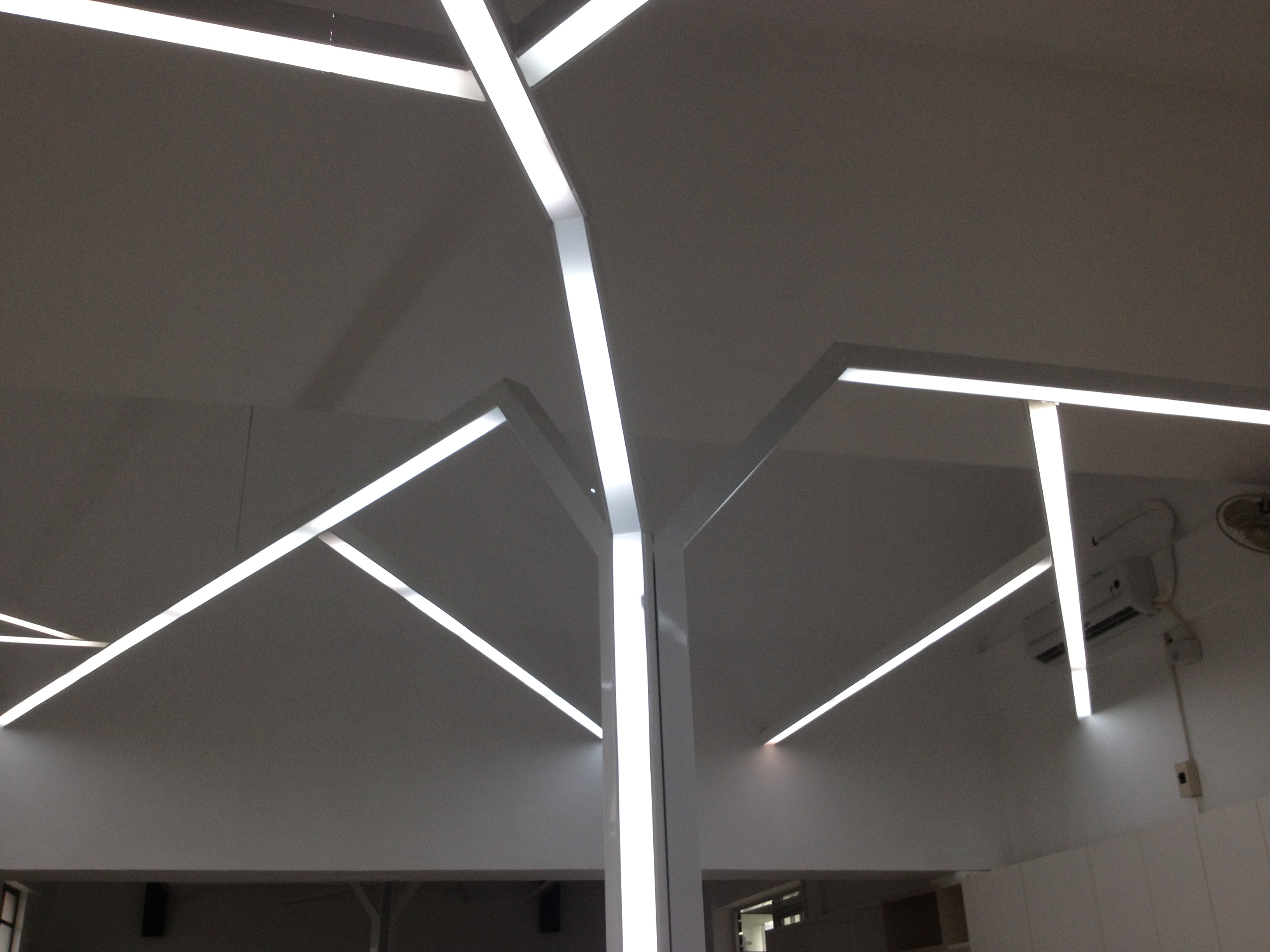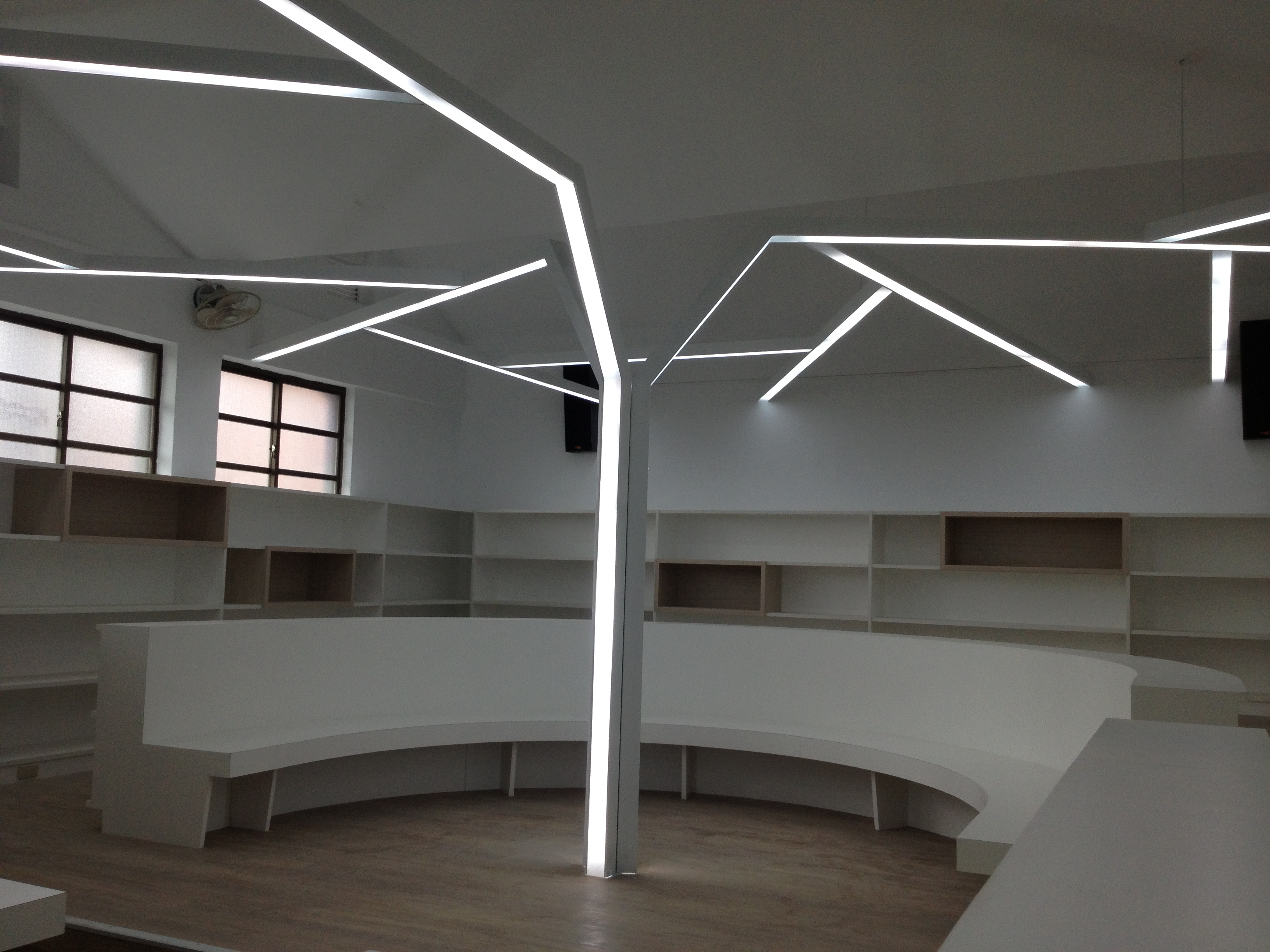 C.長桌讀書區:主要作為閱覽區使用,並輔以長桌以讓機能擴增為:同學自修、教師會議、桌面閱覽使用。整體並以高度80公分支架高地坪作為高程,使得本區可以有「綜觀全場」的使用氛圍。而此處更以「大樹」形體燈具呼應「樹下之學習精神」。