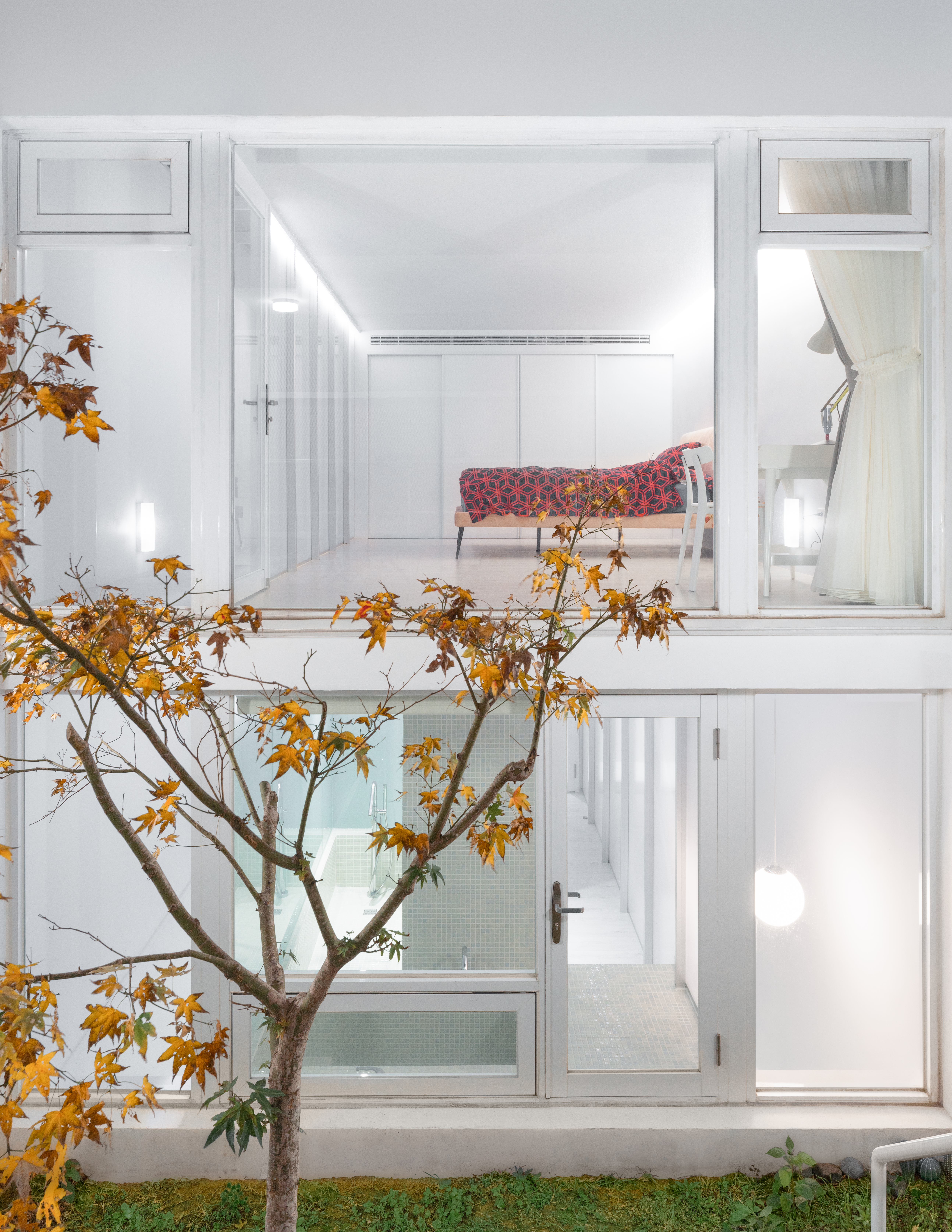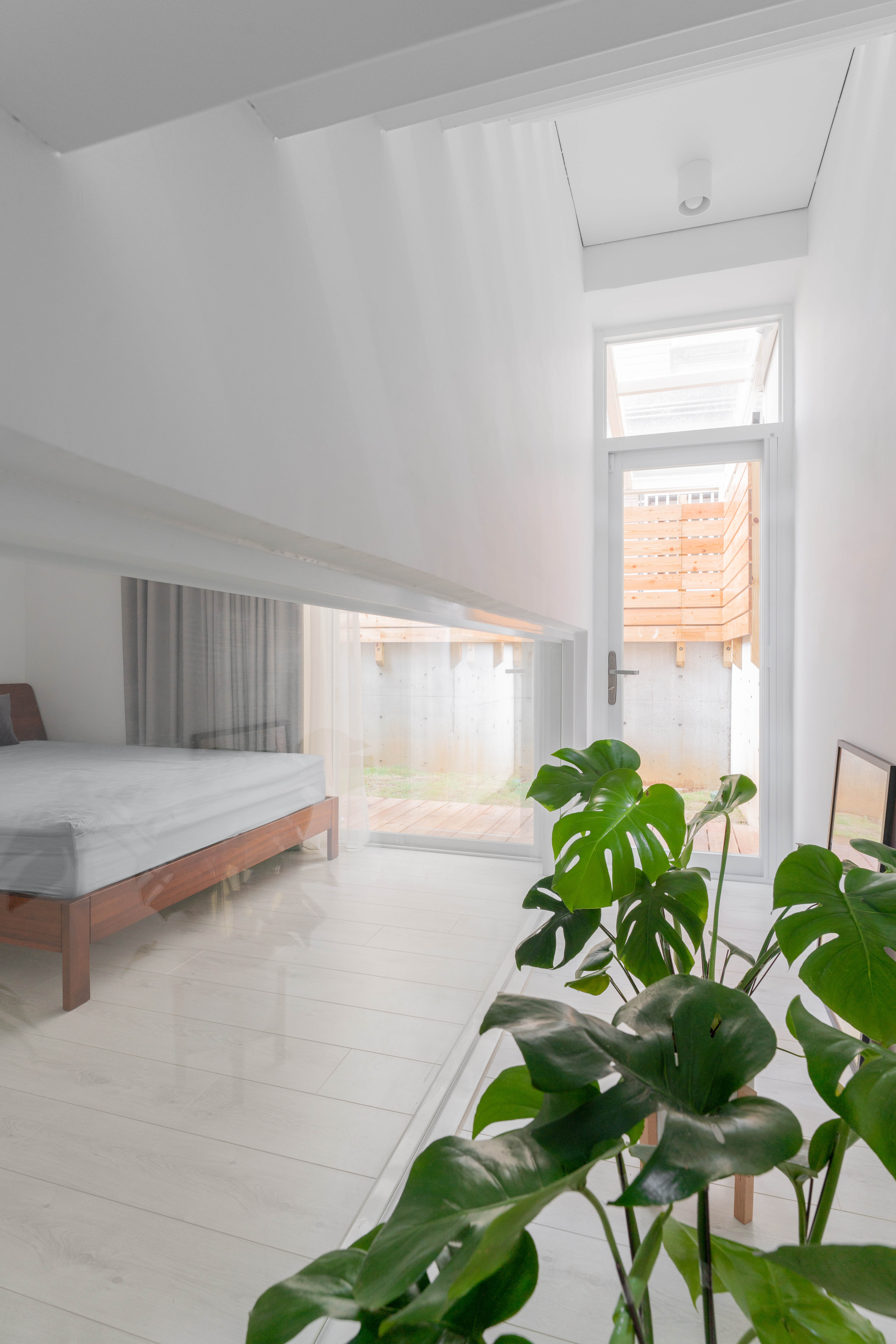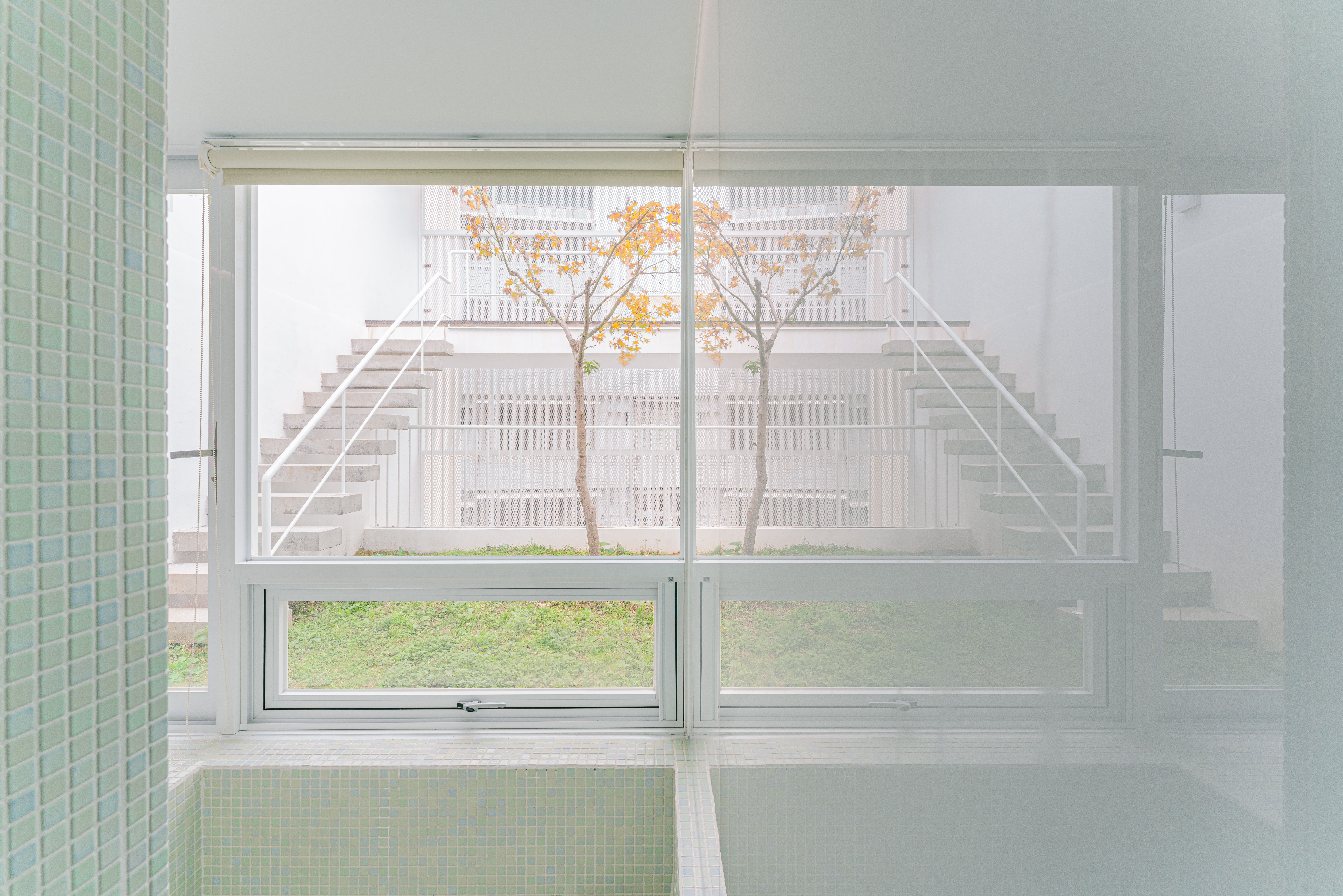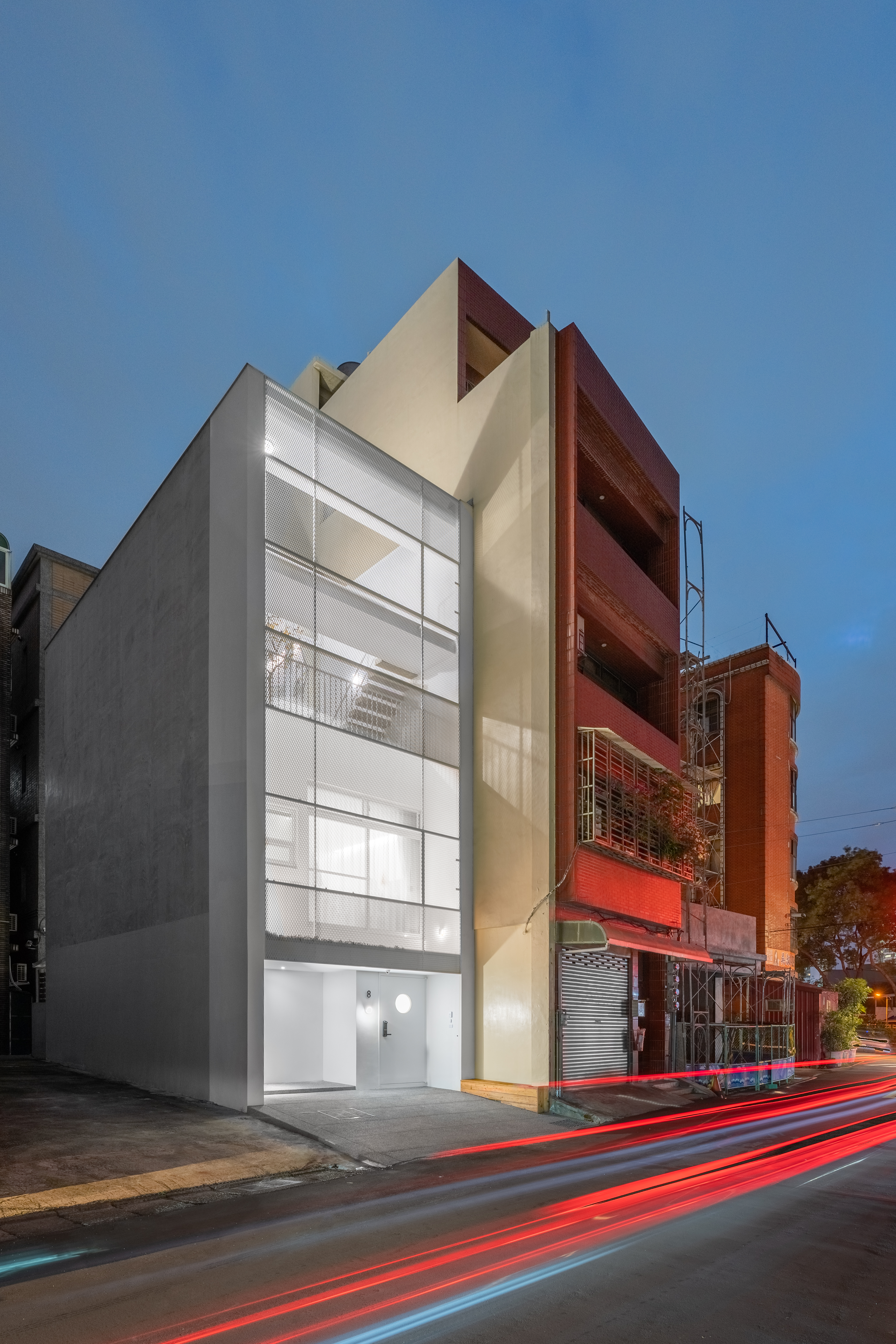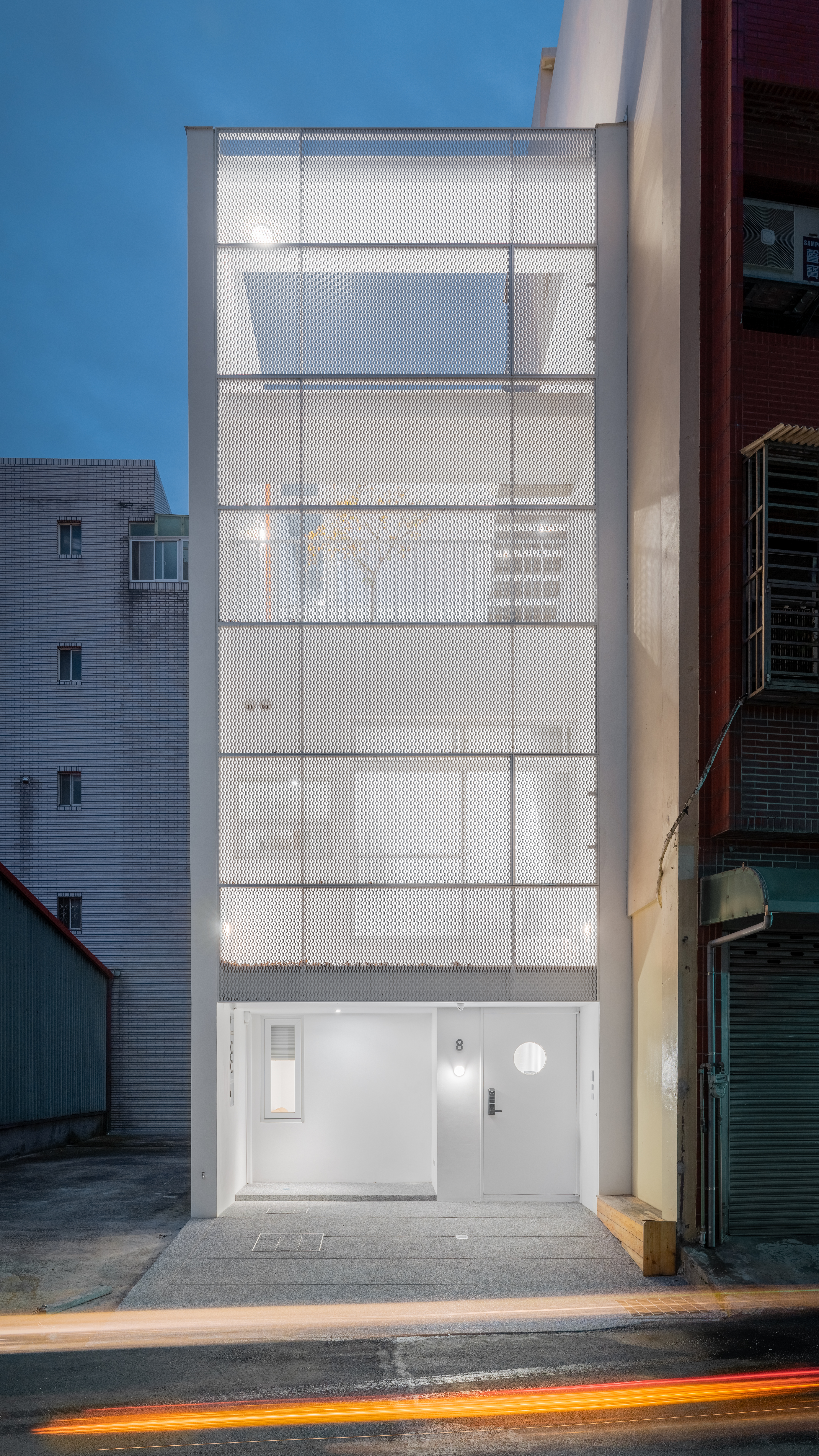 典型樣板建築包含剖面中存在的的前後陽台及中間的使用空間,這個空間不分使用性質都是一樣的高度。平面上除了前中後三個部分,為了採光可能會加上一個方正的天井。我們試著將前中後三個部分加入一些參數調整,而這調整後的室內外介面關係讓所有的空間顯得非常不同,大大提升了空間的品質。而樣版建築裡的天井雖然有效的提供採光但卻無法讓室內空間有效的整合,最後只是讓前中後三段的建築變成五段的分別而已。所以我們利用樓梯的存在把左右牆面與使用空間脫離出來產生貫穿建築有效的採光且完全不影響空間的連結與使用。最後我們利用浴室獨立出入的陽台、餐廳的室內裝修以及建築整體的材質設定,讓空間本身充滿更多故事以及女性委託人的特質。