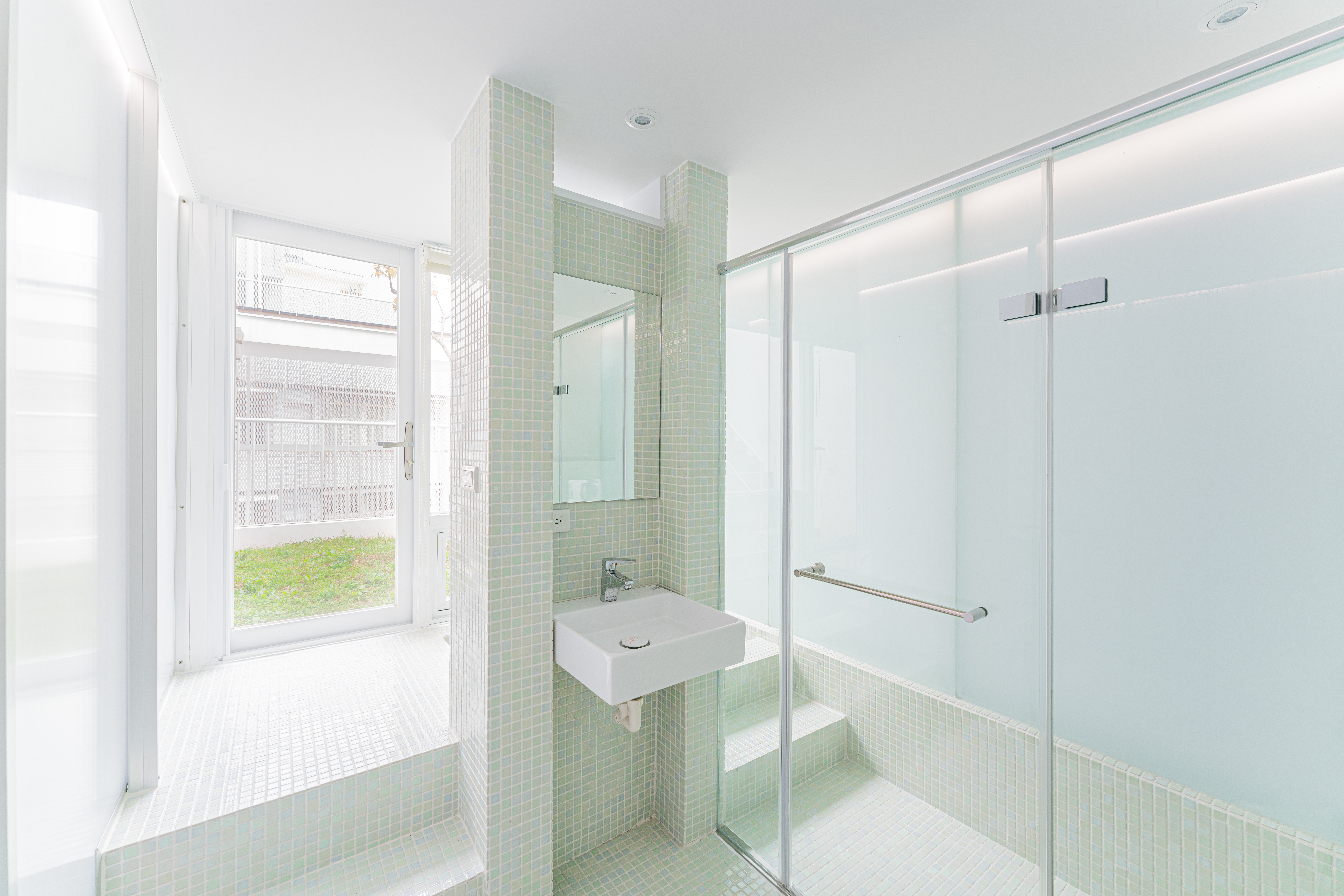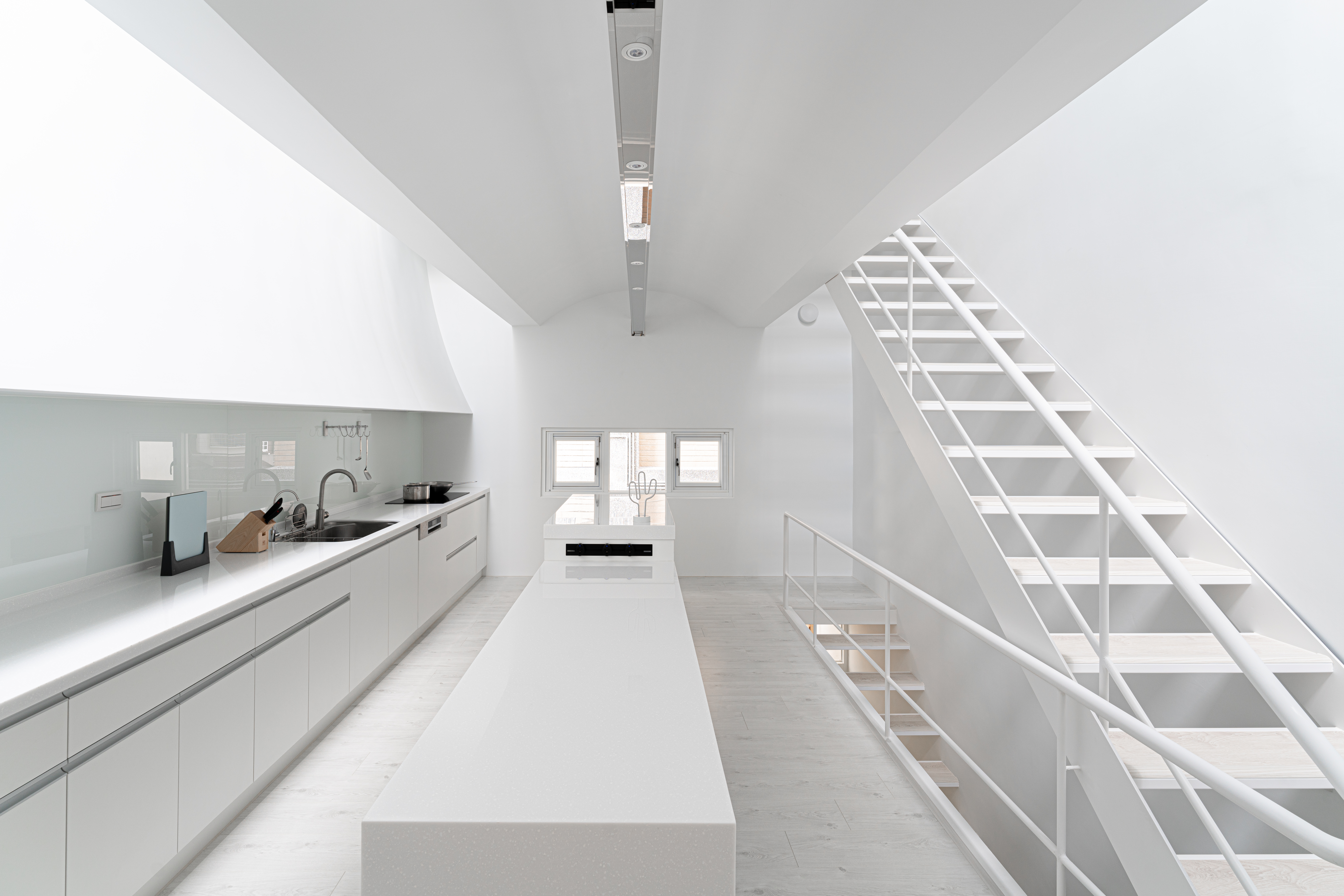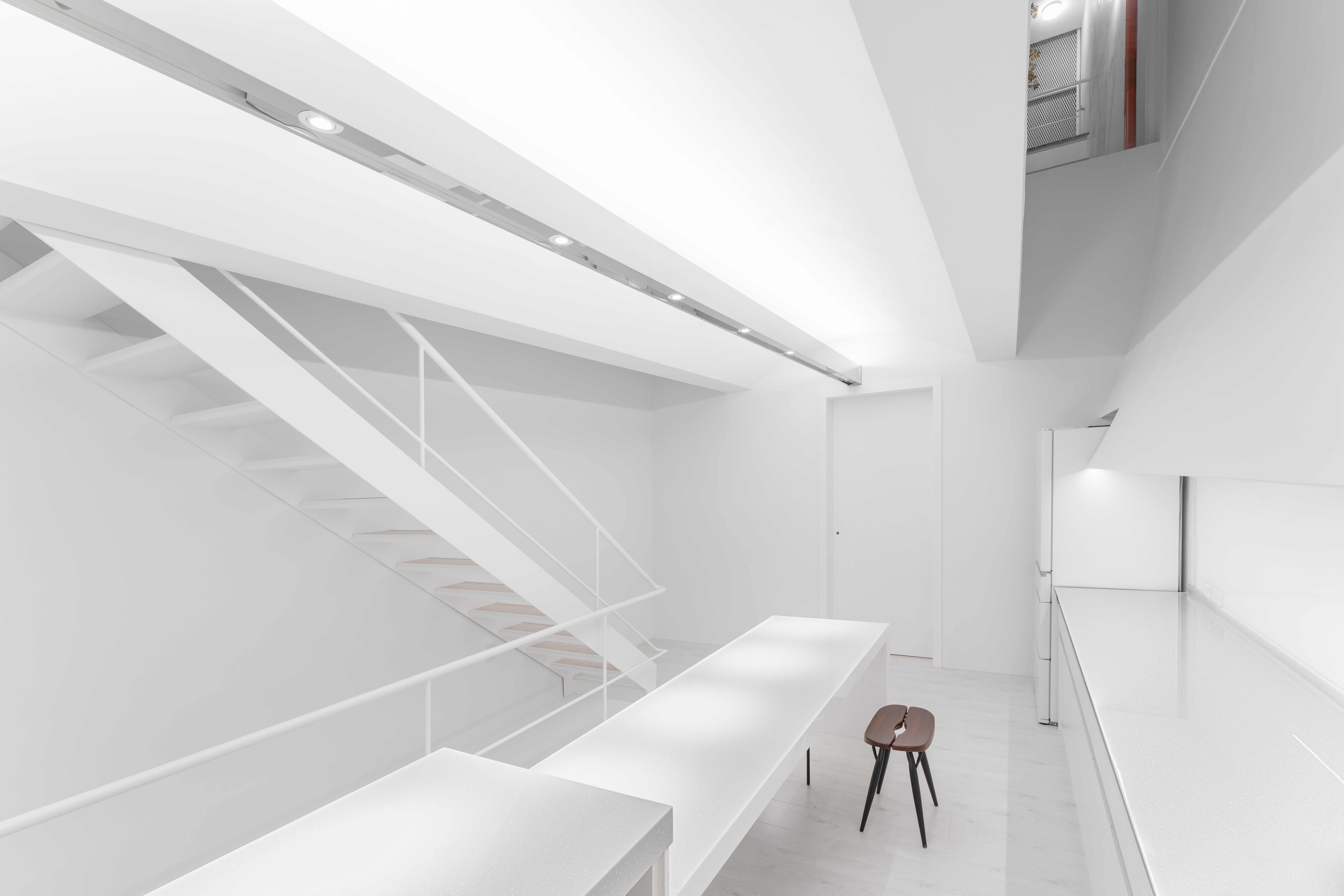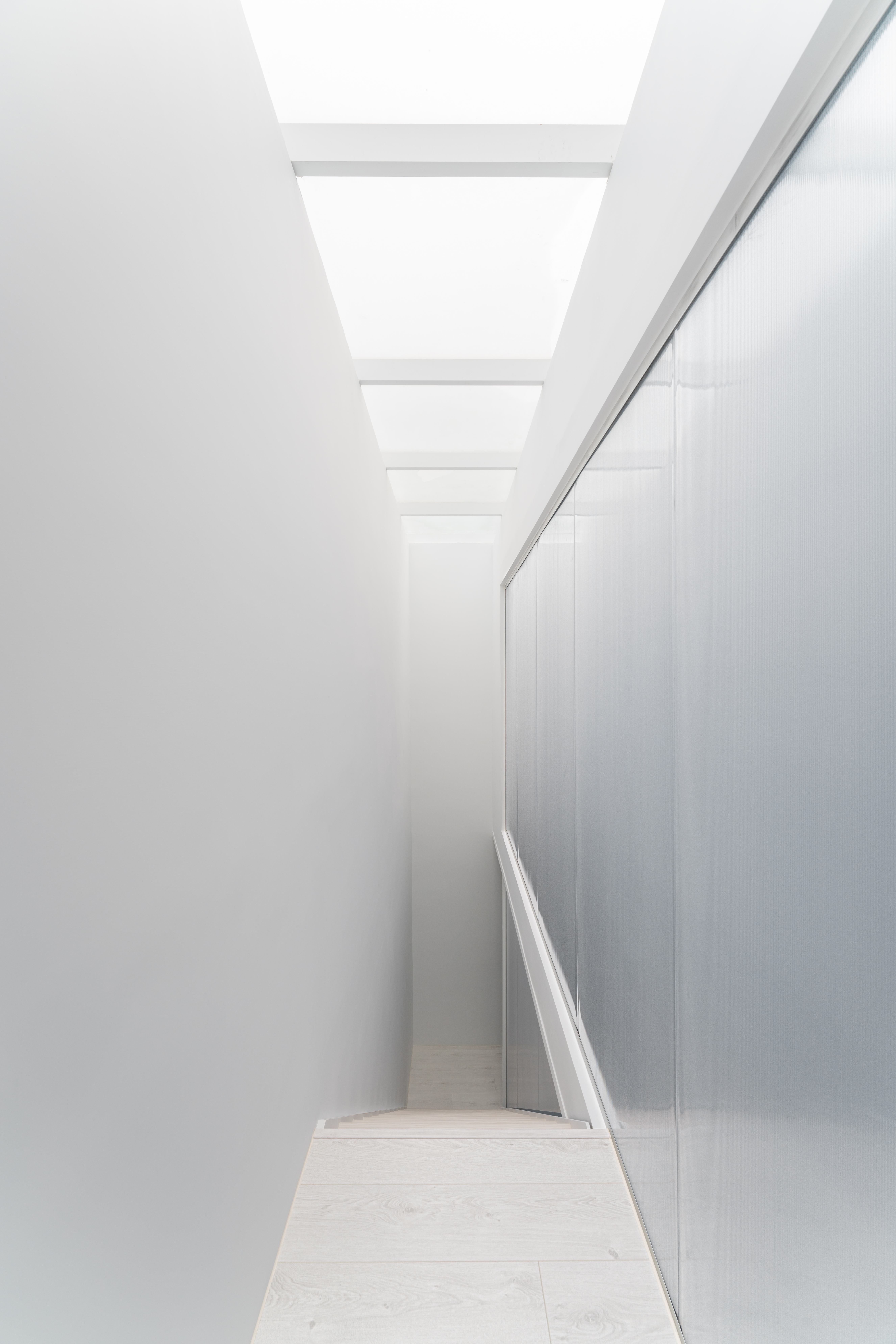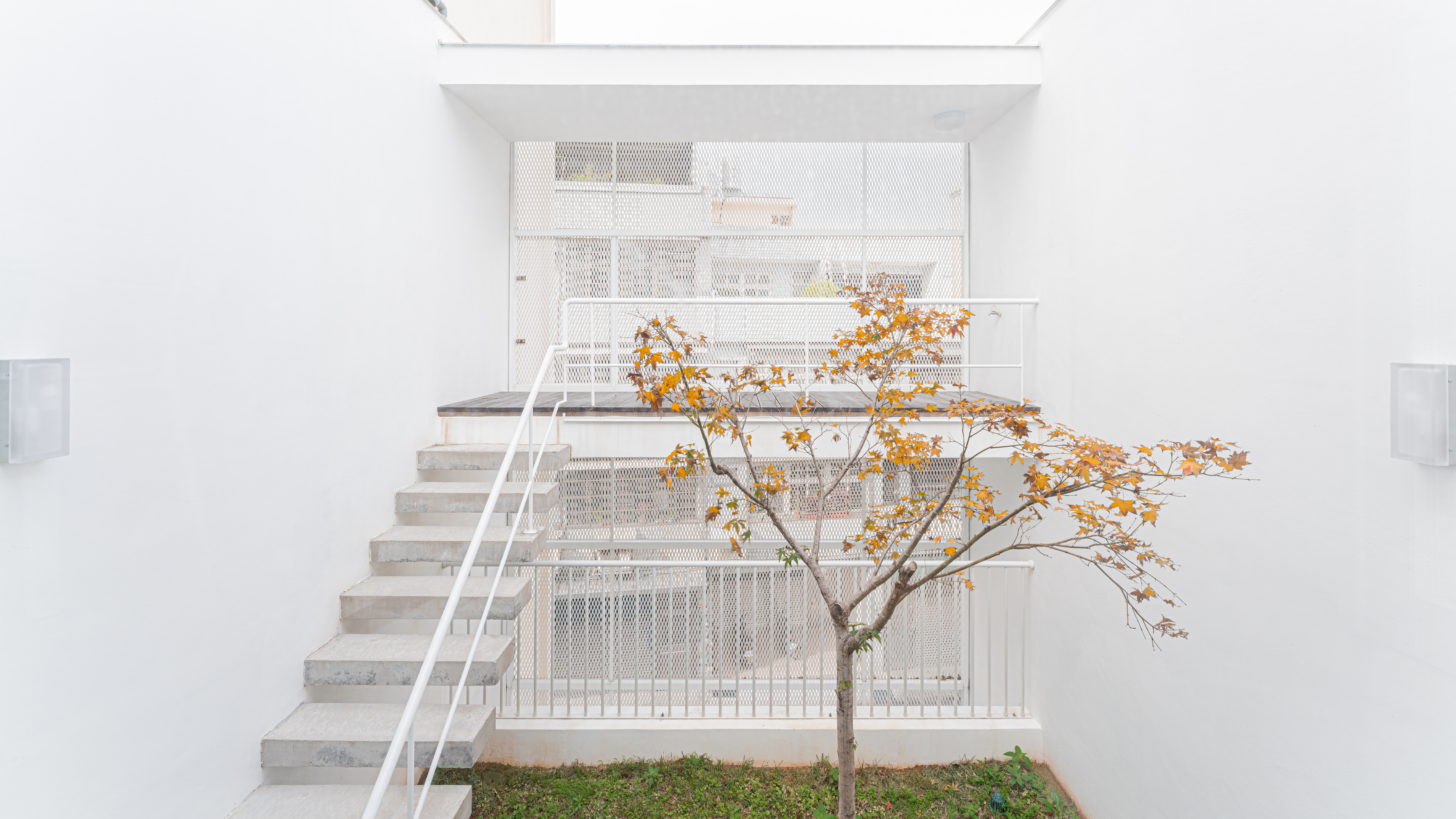 典型樣板建築包含剖面中存在的的前後陽台及中間的使用空間,這個空間不分使用性質都是一樣的高度。平面上除了前中後三個部分,為了採光可能會加上一個方正的天井。我們試著將前中後三個部分加入一些參數調整,而這調整後的室內外介面關係讓所有的空間顯得非常不同,大大提升了空間的品質。而樣版建築裡的天井雖然有效的提供採光但卻無法讓室內空間有效的整合,最後只是讓前中後三段的建築變成五段的分別而已。所以我們利用樓梯的存在把左右牆面與使用空間脫離出來產生貫穿建築有效的採光且完全不影響空間的連結與使用。最後我們利用浴室獨立出入的陽台、餐廳的室內裝修以及建築整體的材質設定,讓空間本身充滿更多故事以及女性委託人的特質。