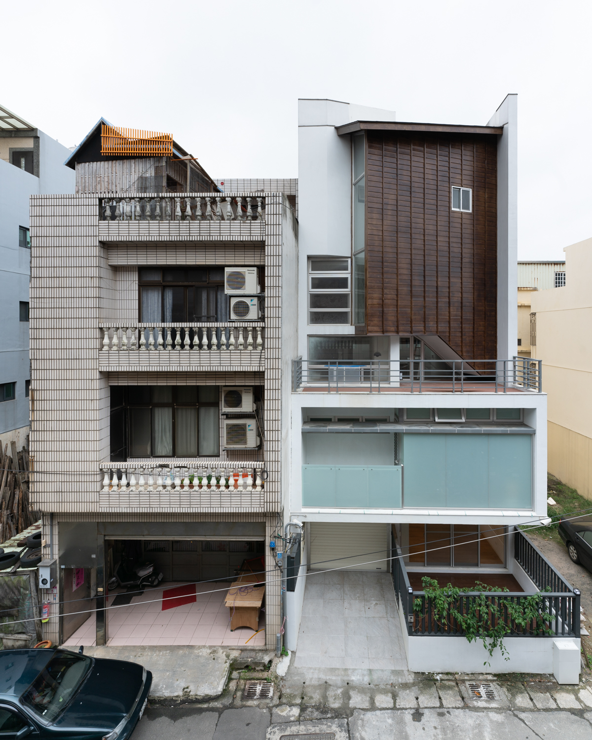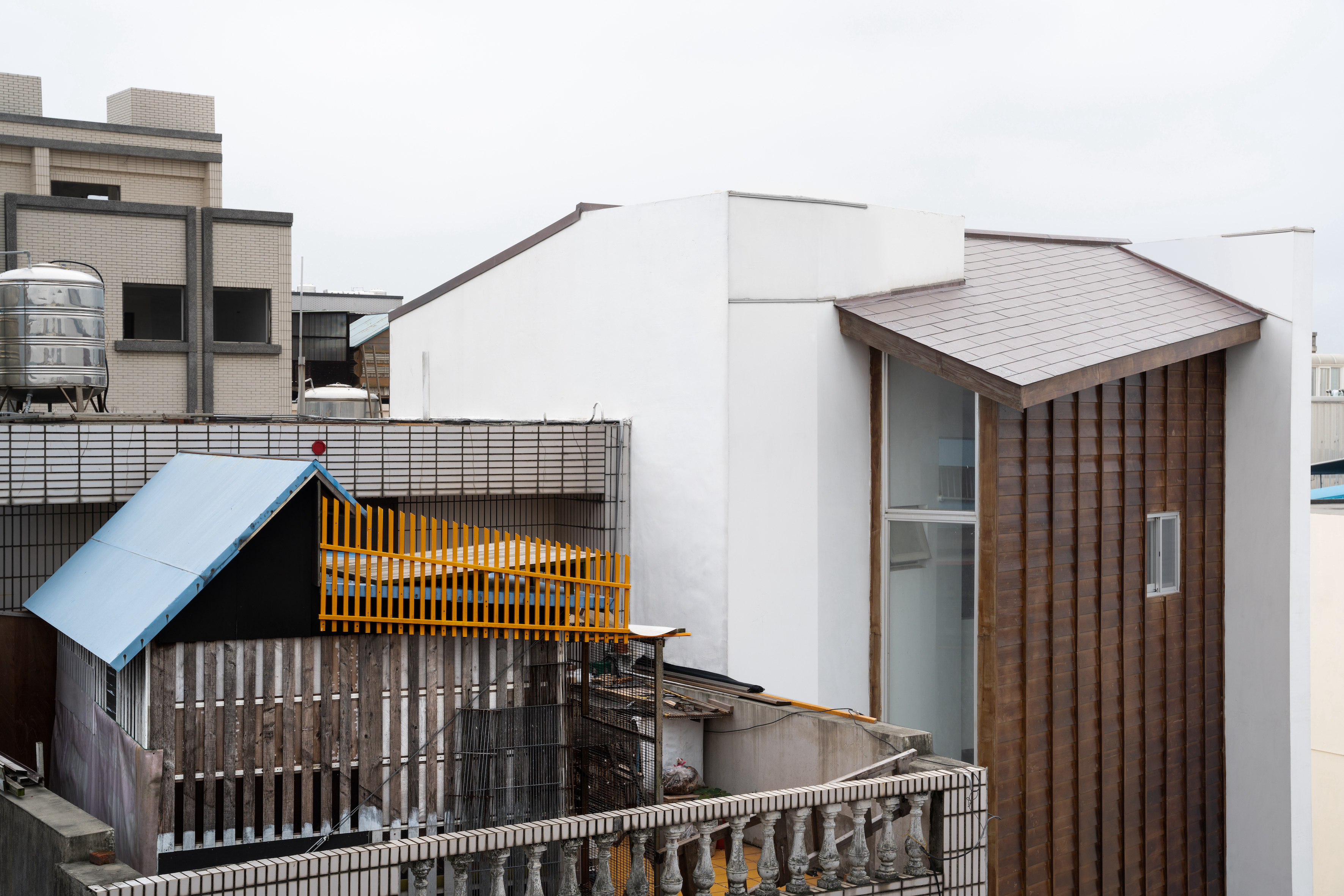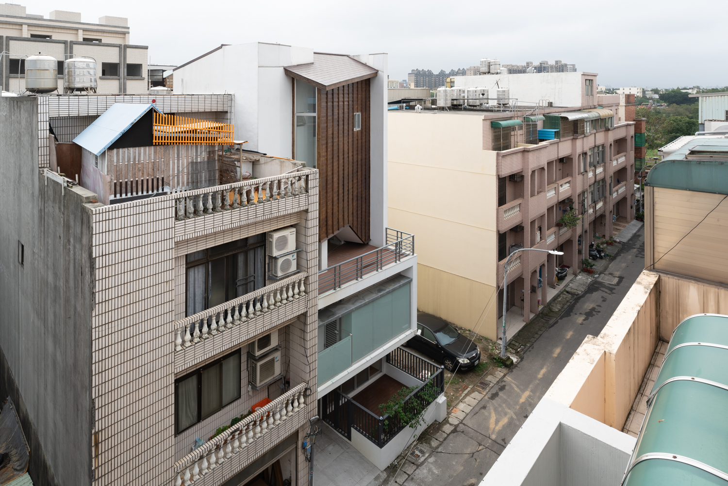 台灣都市住宅中長輩房大多時候是被安排在一樓停車場的後方,以方便進出,這樣便犧牲了長輩的空間品質。因此它被移到了入口上方並刻意壓低高度,讓入口空間壓縮再放大,也能以充滿光線的陽台度過每個溫暖的冬日。二樓餐廳,家人聯繫的處所,以階梯形式連結的起居室、小戲院、書房,並透過木質高窗讓陽光以幻離的方式照攬這家人。三樓是主人的臥房,在房內就能夠以室內的陽台窗開向劇院。留作頂層的是兩個小孩的房間,抽離為一個獨立使用的夾層,讓每天早上孩子們刷牙、洗臉的動作,能夠與家人、陽光說聲おはよう!而迴旋空間序列的最主要目的,是讓這個家在未來因為有了第四代的加入,這頂層的空間得以調整作為一獨立的、完整的同居使用空間。