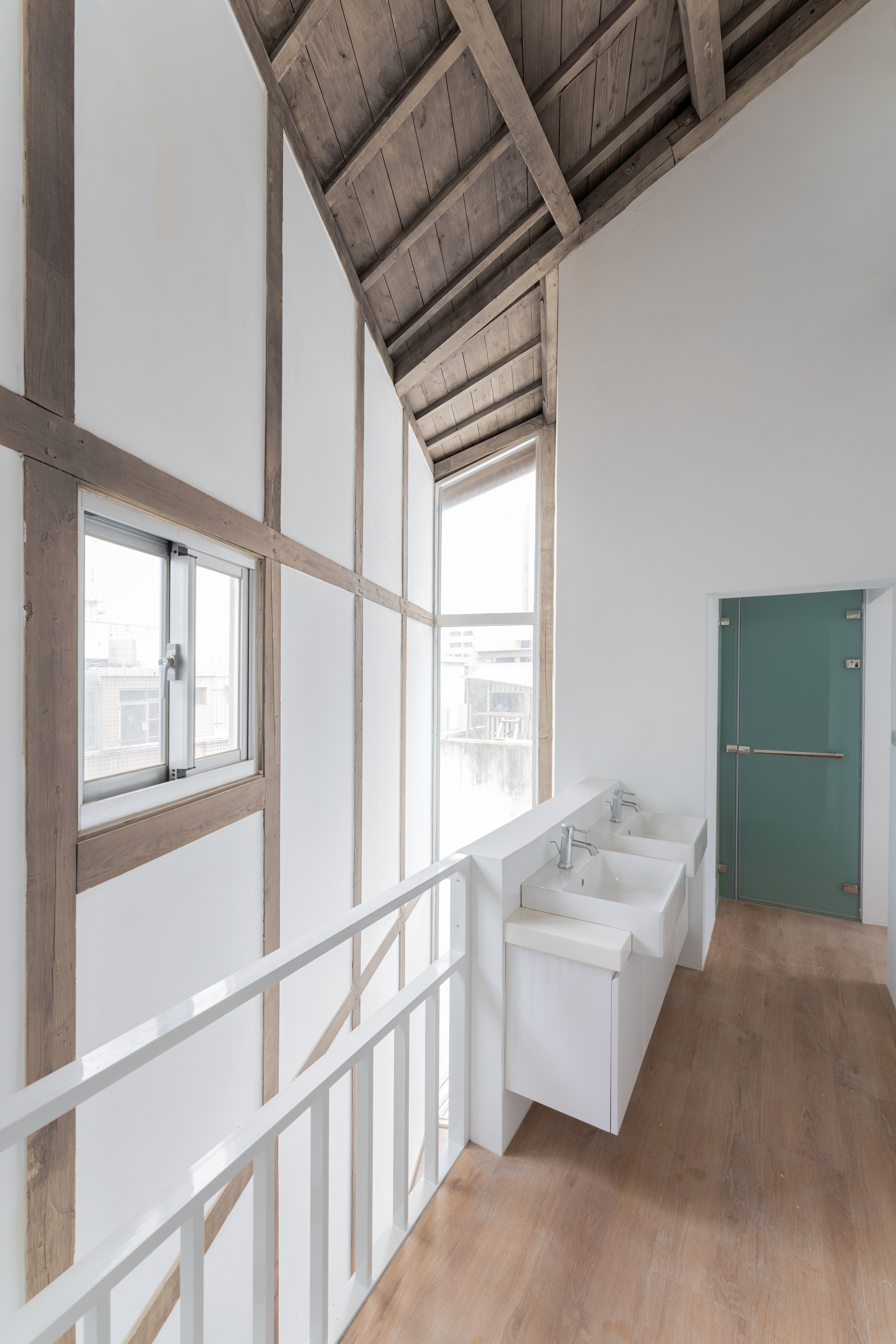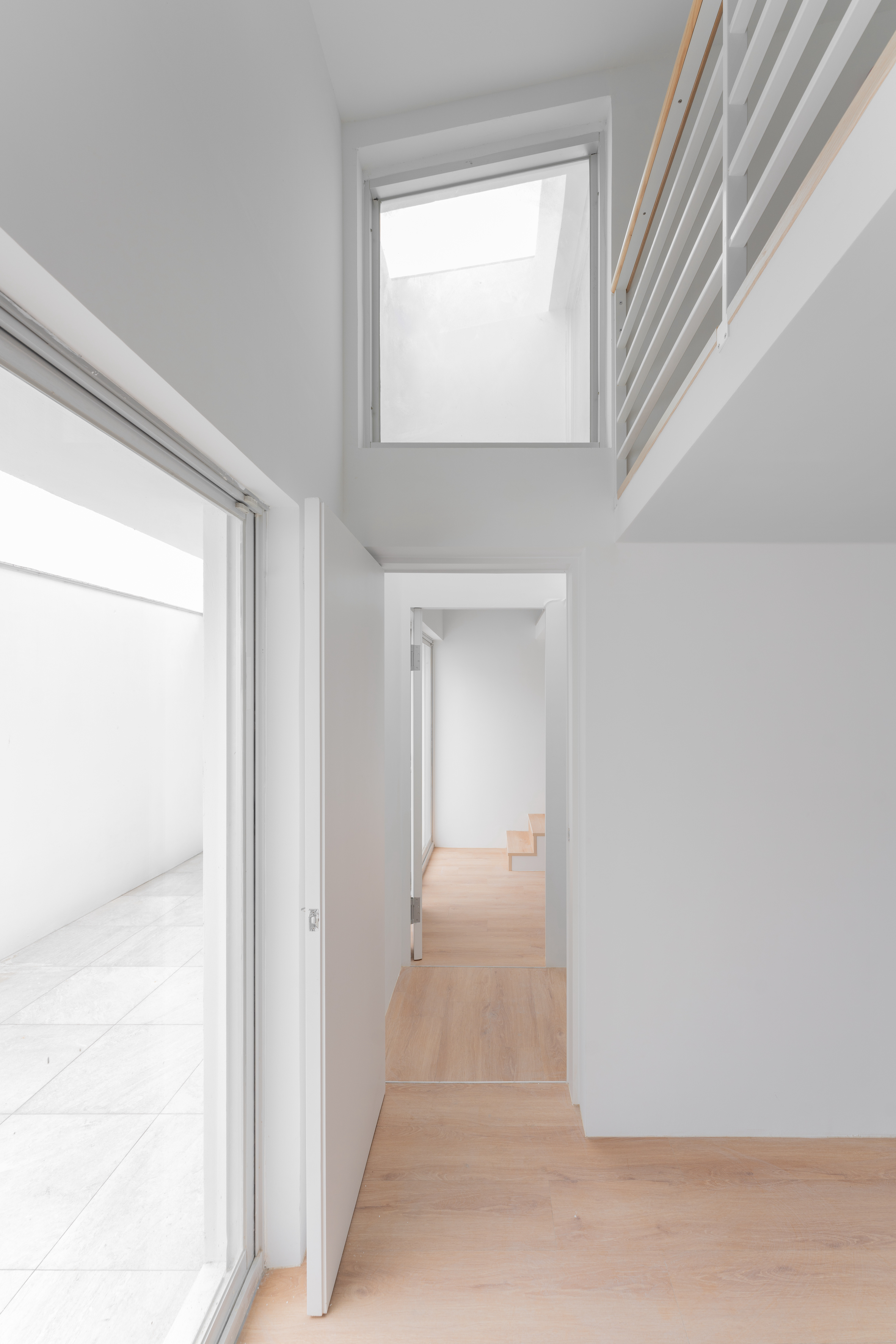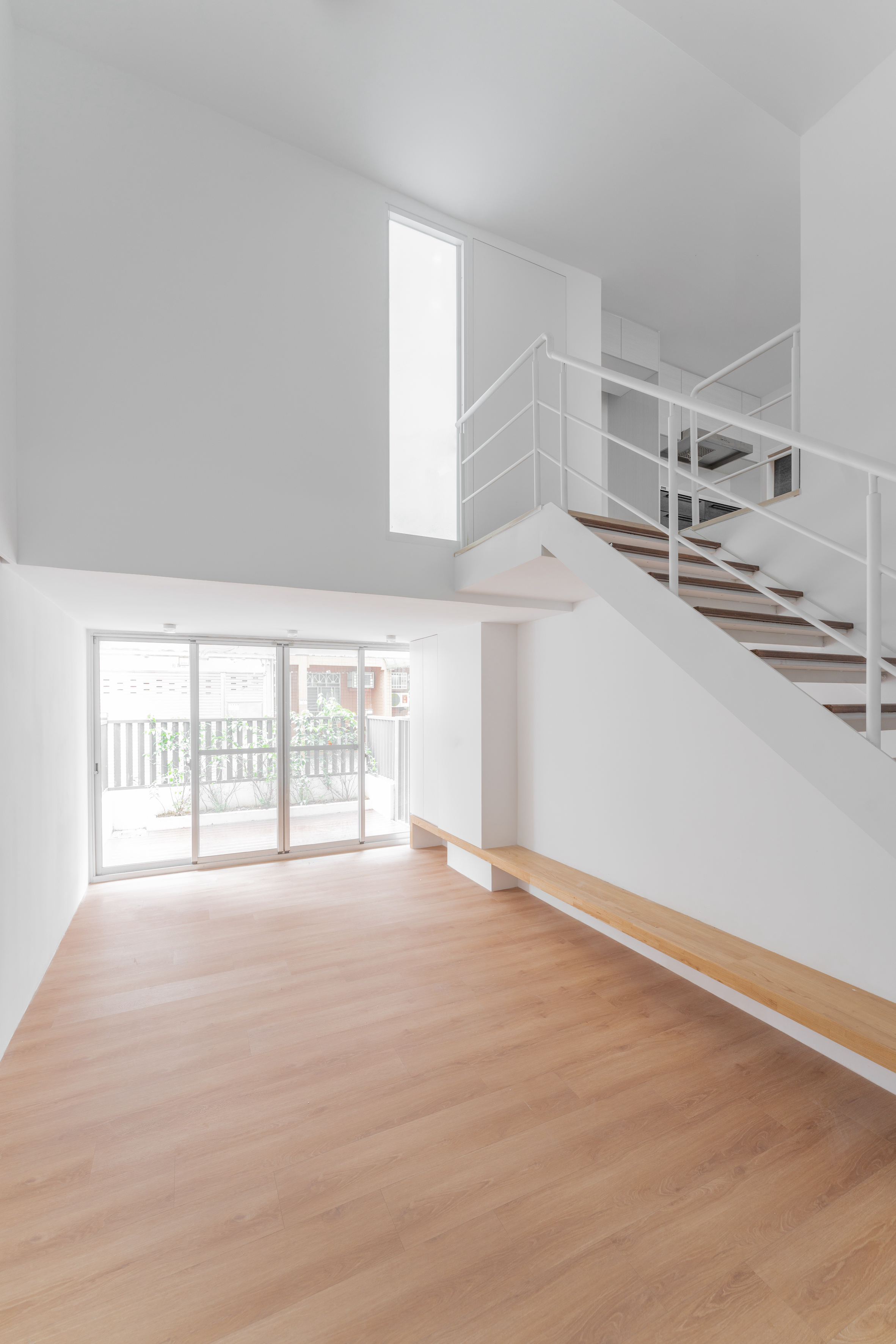 台灣都市住宅中長輩房大多時候是被安排在一樓停車場的後方,以方便進出,這樣便犧牲了長輩的空間品質。因此它被移到了入口上方並刻意壓低高度,讓入口空間壓縮再放大,也能以充滿光線的陽台度過每個溫暖的冬日。二樓餐廳,家人聯繫的處所,以階梯形式連結的起居室、小戲院、書房,並透過木質高窗讓陽光以幻離的方式照攬這家人。三樓是主人的臥房,在房內就能夠以室內的陽台窗開向劇院。留作頂層的是兩個小孩的房間,抽離為一個獨立使用的夾層,讓每天早上孩子們刷牙、洗臉的動作,能夠與家人、陽光說聲おはよう!而迴旋空間序列的最主要目的,是讓這個家在未來因為有了第四代的加入,這頂層的空間得以調整作為一獨立的、完整的同居使用空間。