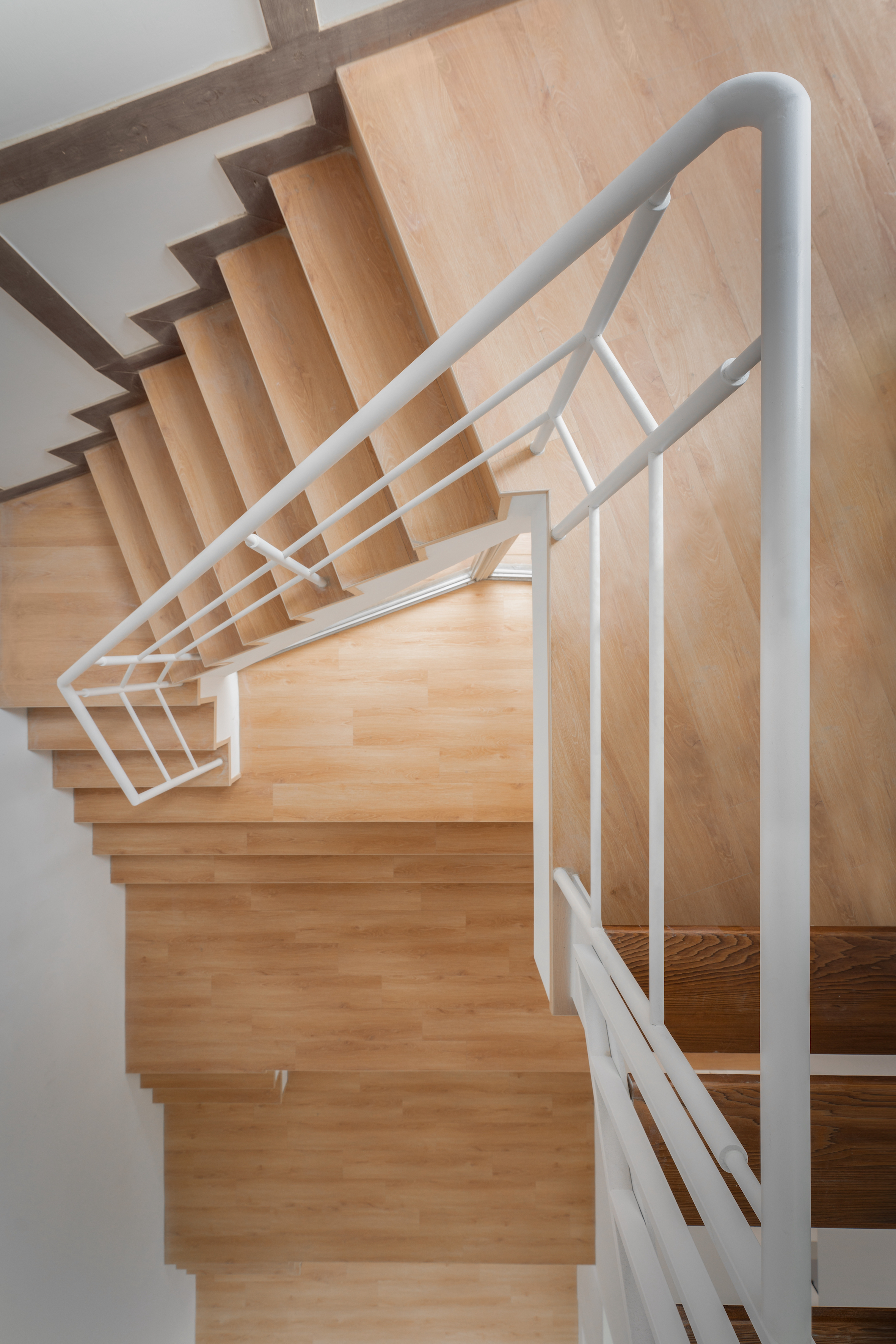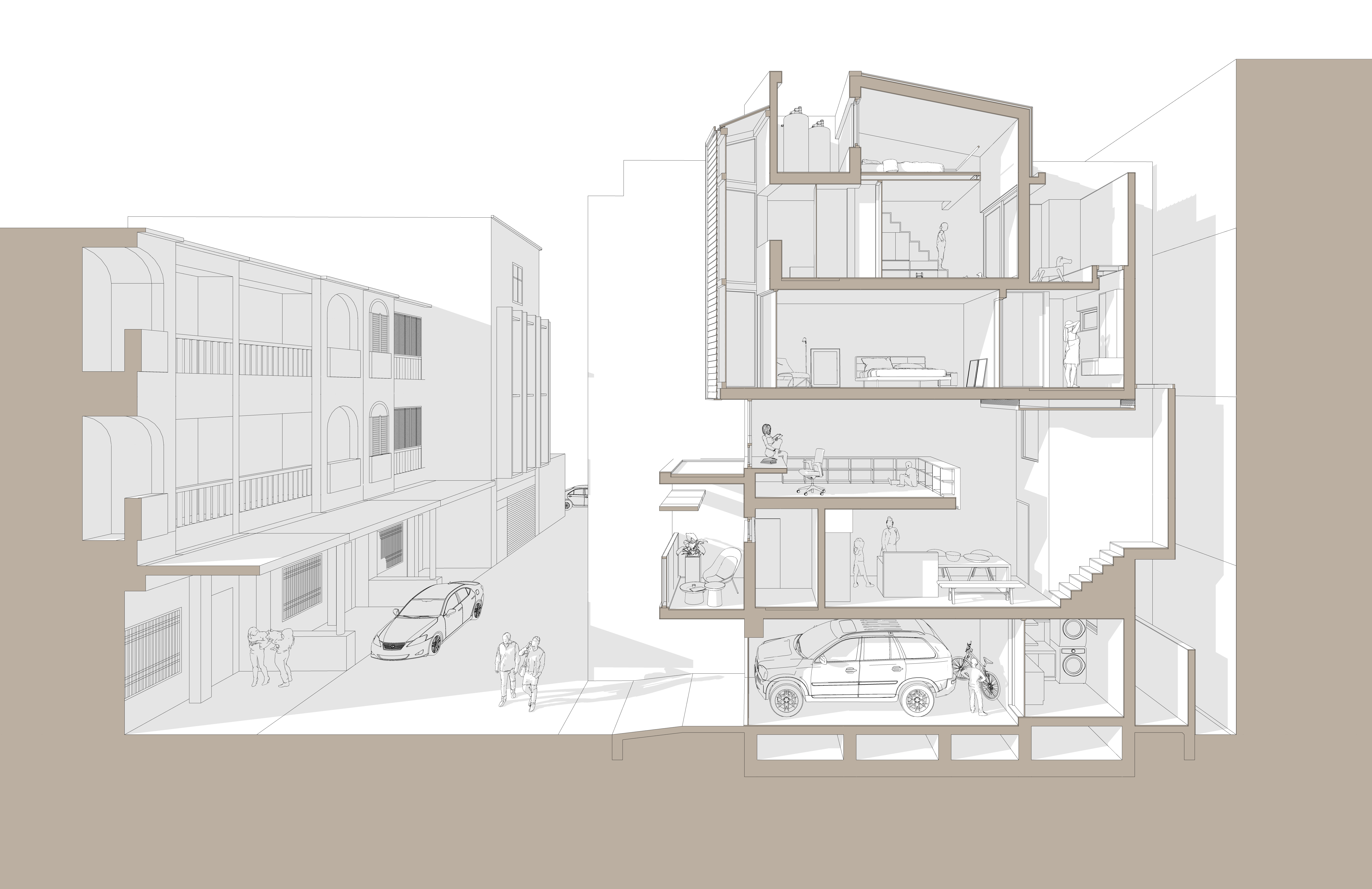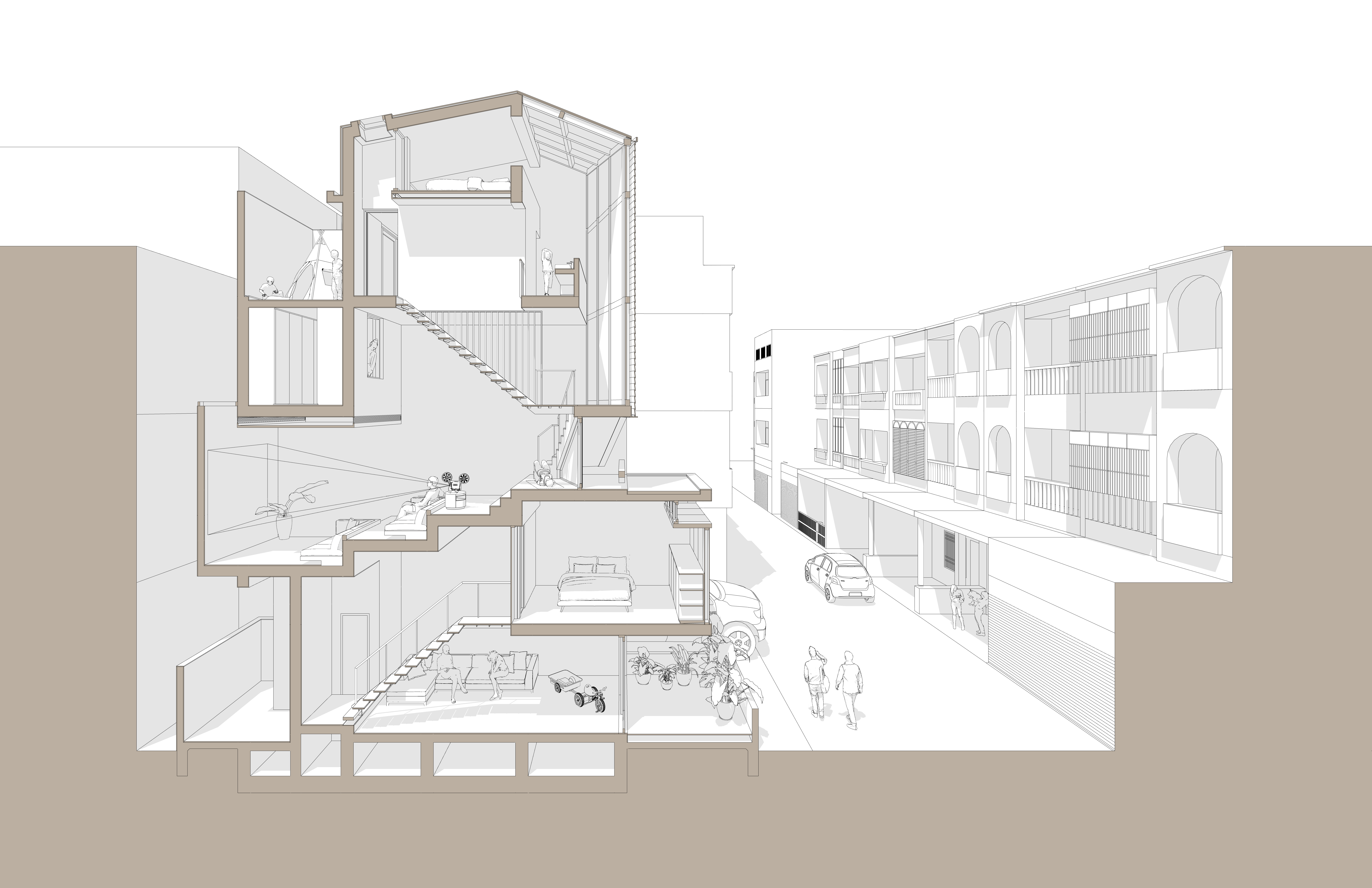 Traditionally, the elderly room is arranged to the ground floor near the rear parking for convenience, which reduces quality of life. To improve that, the room was relocated to the space above the entrance with ceiling height deliberately adjusted for magnifying effect, connecting outward to the neighborhood via a sunny balcony. The flow path seamlessly extends outward to the street. On the second floor, the dining room is the hub for connection and communication, branching out to functional units like living room, theatre, or reading room. The master bedroom on the third floor features an indoor balcony overlooking the theatre. On top of that is a sequence of units in spiral arrangement for two kids, where small talks would naturally happen during the morning routine at the mezzanine.