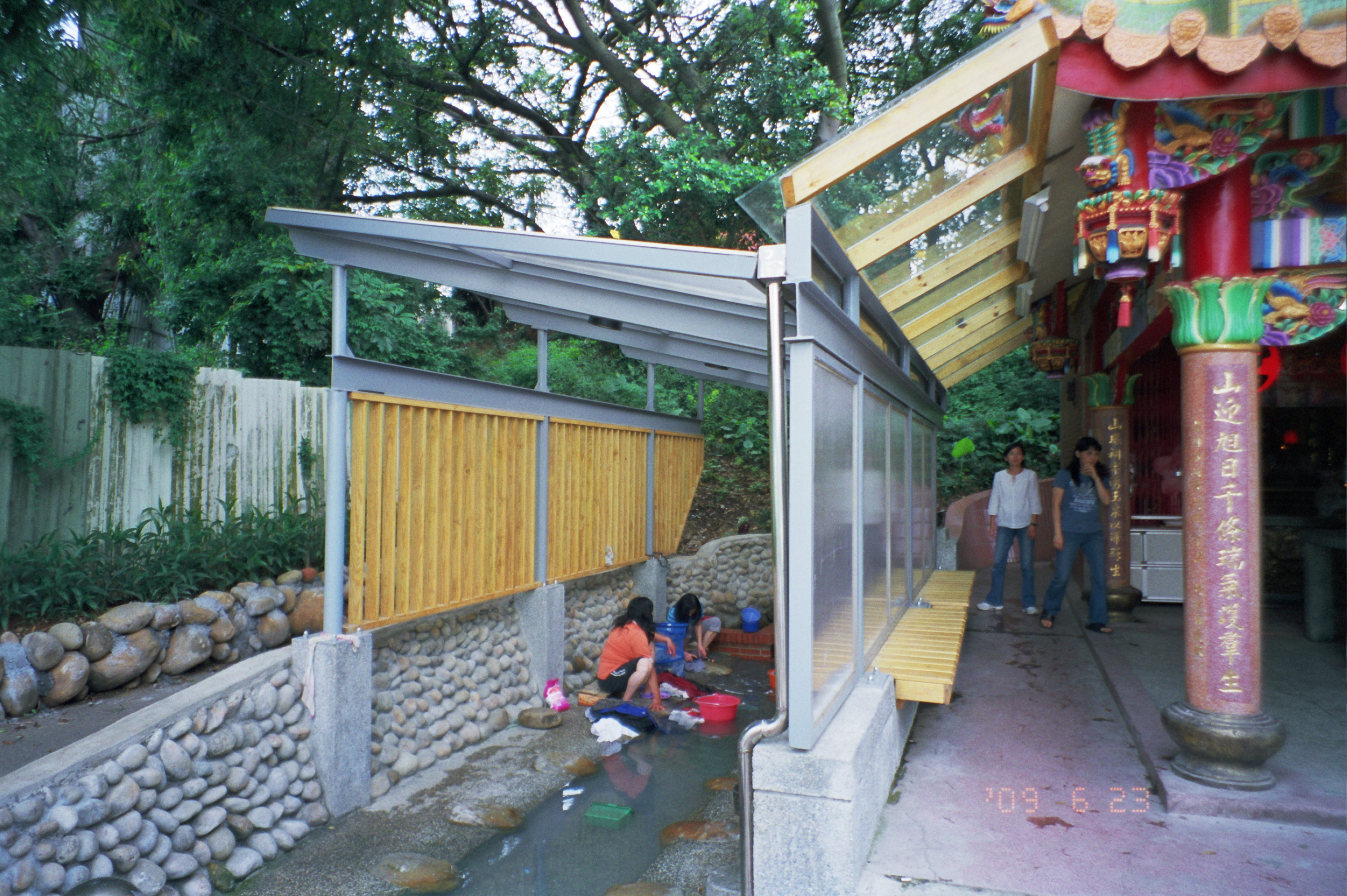 一號池,於福山宮旁,居民的信仰、精神的寄託,霧面玻璃區隔浣衣間與宮廟,通透性產生若即若離的空間,透過人的行為拉近關係,玻璃頂蓋讓陽光照攬浣衣間,象徵著人情的溫暖。