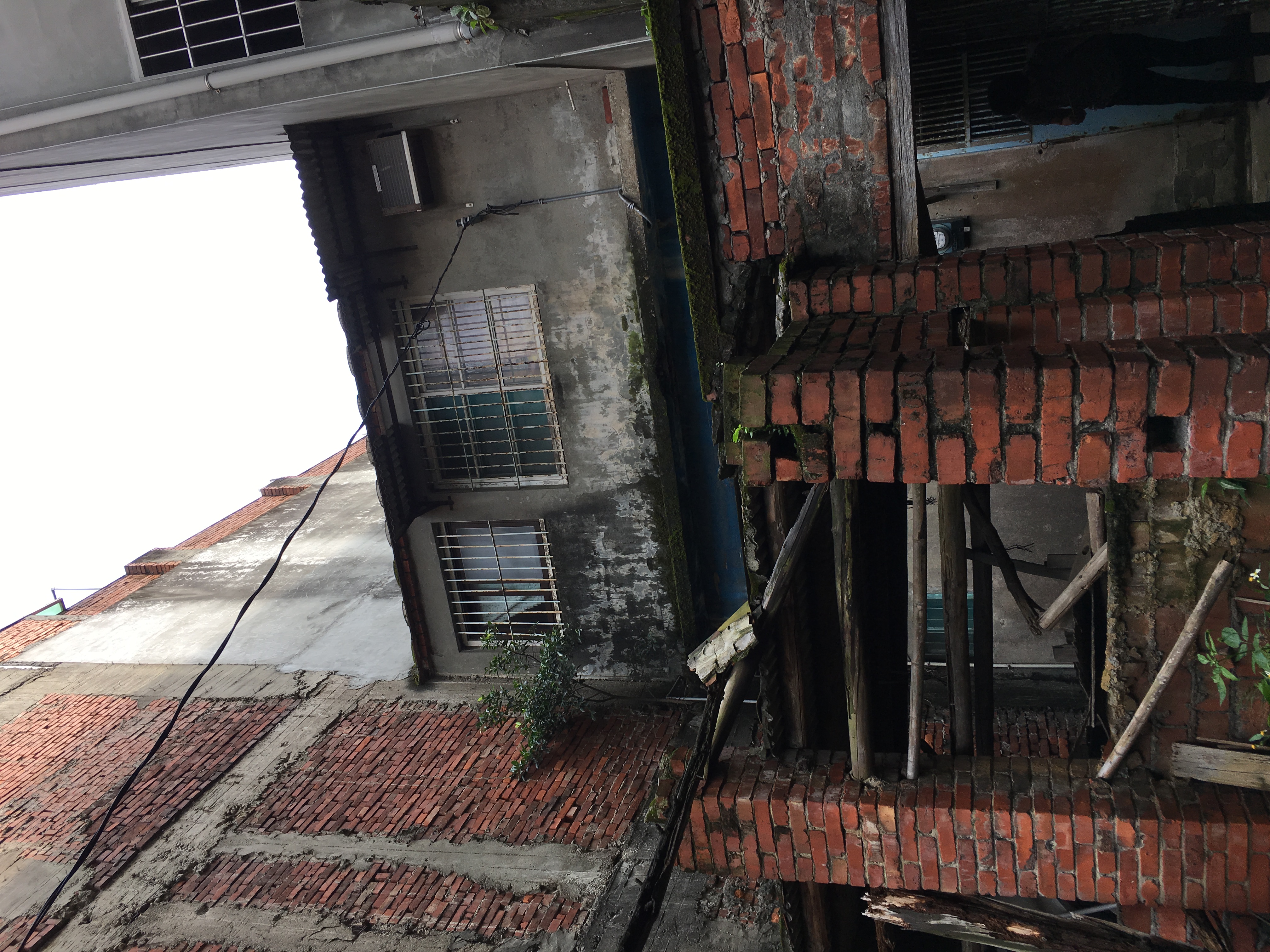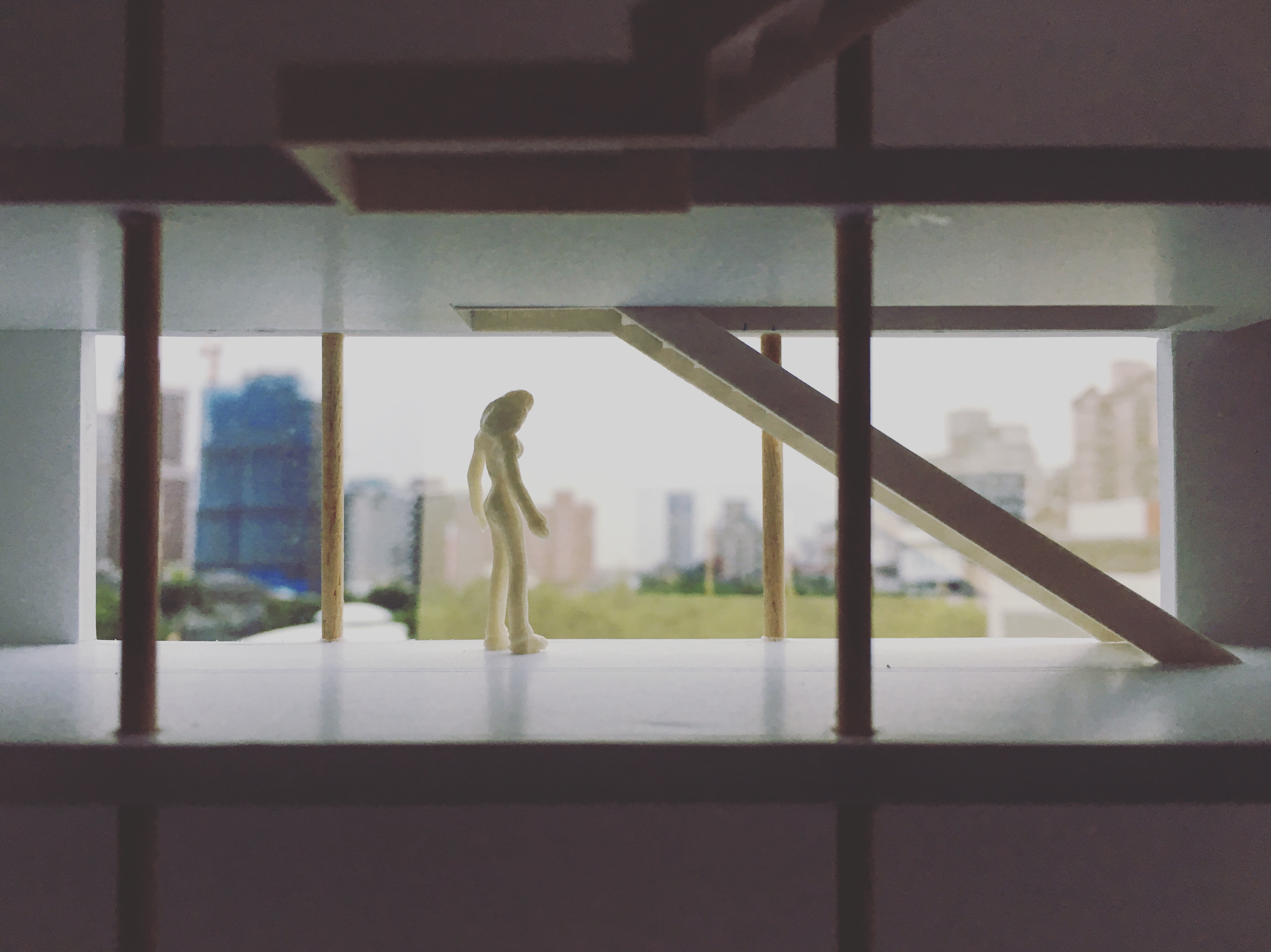 市外桃源。人聲鼎沸的傳統市場,攤販叫賣聲是耳熟能響的生活配樂,古色古香的紅磚屋緊密排列著,人們不斷地在小巷裡穿梭,尋找陽光充斥與希望相隨的出口。 越過攤販走過暗巷,叫賣聲逐漸消失,建築物後方是記載歲月的古厝,階梯上的青苔,牆上的水漬,生鏽的鐵件,光線從中庭天井灑下,彷彿在城市中找到珍貴的喘息之處。 一樓融入市場的店鋪,從騎樓沿著紅磚牆而上抬頭仰望,通透沒有牆板阻隔可見建築的原貌,樓板退縮形成連貫的挑空,將三層樓高的紅磚牆,承載兒時回憶的畫面盡收眼底。 二樓對外開放的空間,聚集朋友談天說笑,坐在陽台與室內的落差上,提供自然光與風竄進竄出的機會,沿用古厝天井採光手法讓陽光瀰漫在這狹長的空間。 樓梯間屬性的劃分,兩位女士的領域,望著窗外共同料理陶醉其中,兩樓高的出口、三樓高的磚牆,陽台的比例美學賦予視覺的震撼,在狹窄空間敞開眼界,臥房PC板,似內又似外的朦朧質感,兼具隱密及感受彼此存在。 屋頂花園人類與生態的共存,不受基地及街屋的限制來控制我們的生活方式。